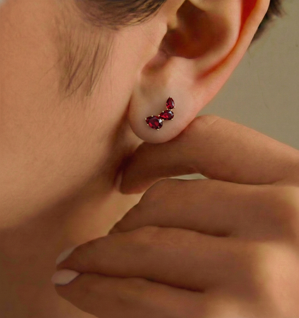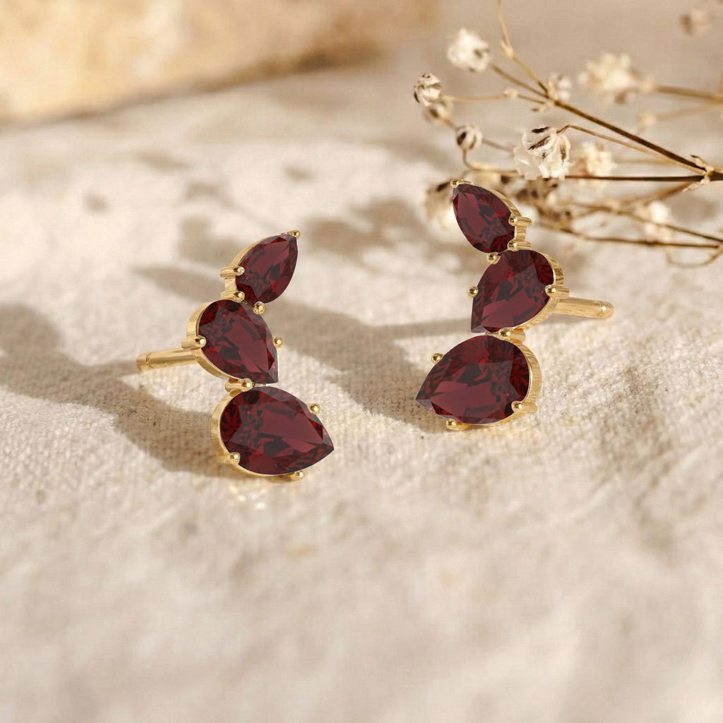 Discover the timeless beauty of these Natural Garnet Pear Stud Earrings, crafted in high-quality yellow gold plated brass for a stunning finish. Each earring features six faceted Natural Garnet stones in various pear shapes: 7x5mm (2), 6x4mm (2), and 5x3mm (2), with a total carat weight of 3.30ct. The earrings are designed with a size of 13.80 x 8.00mm and a lightweight of 2.60 grams, ensuring a comfortable fit. Perfect for any occasion, these Natural Garnet earrings add a sophisticated touch to your jewelry collection.