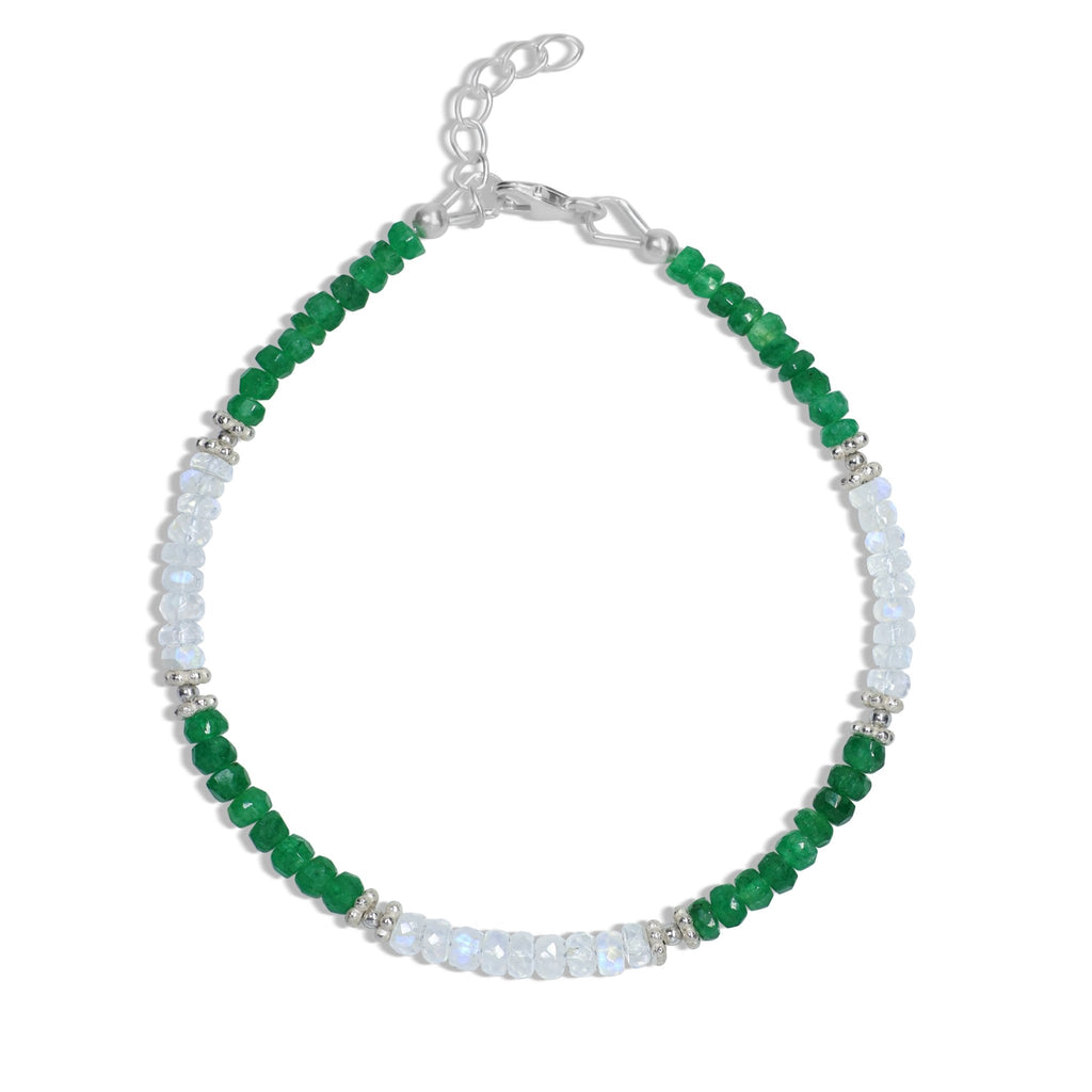 Embrace style with this gorgeous bracelet made of moonstone and emerald beads, which is meant to bring a little bit of gemstone beauty to any ensemble. The bracelet's gorgeous combination of emeralds' lush green charm and moonstone's iridescent glow is expertly counterbalanced by round silver beads that add a chic sheen. With its 925 sterling silver and 18k gold vermeil finish, this bracelet is a luxurious and long-lasting piece of jewelry. A comfortable, adjustable fit is made possible by the piece's 1-inch extender chain and secure lobster claw clasp.