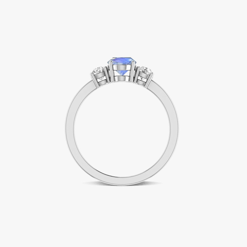 MoonstoneThis enchanting ring features a soft, glowing moonstone gemstone in a beautiful oval shape. Sparkling round cubic zirconia diamonds add a touch of sparkle. The ring is made of sterling silver and is perfect for adding a touch of magic to any outfit.