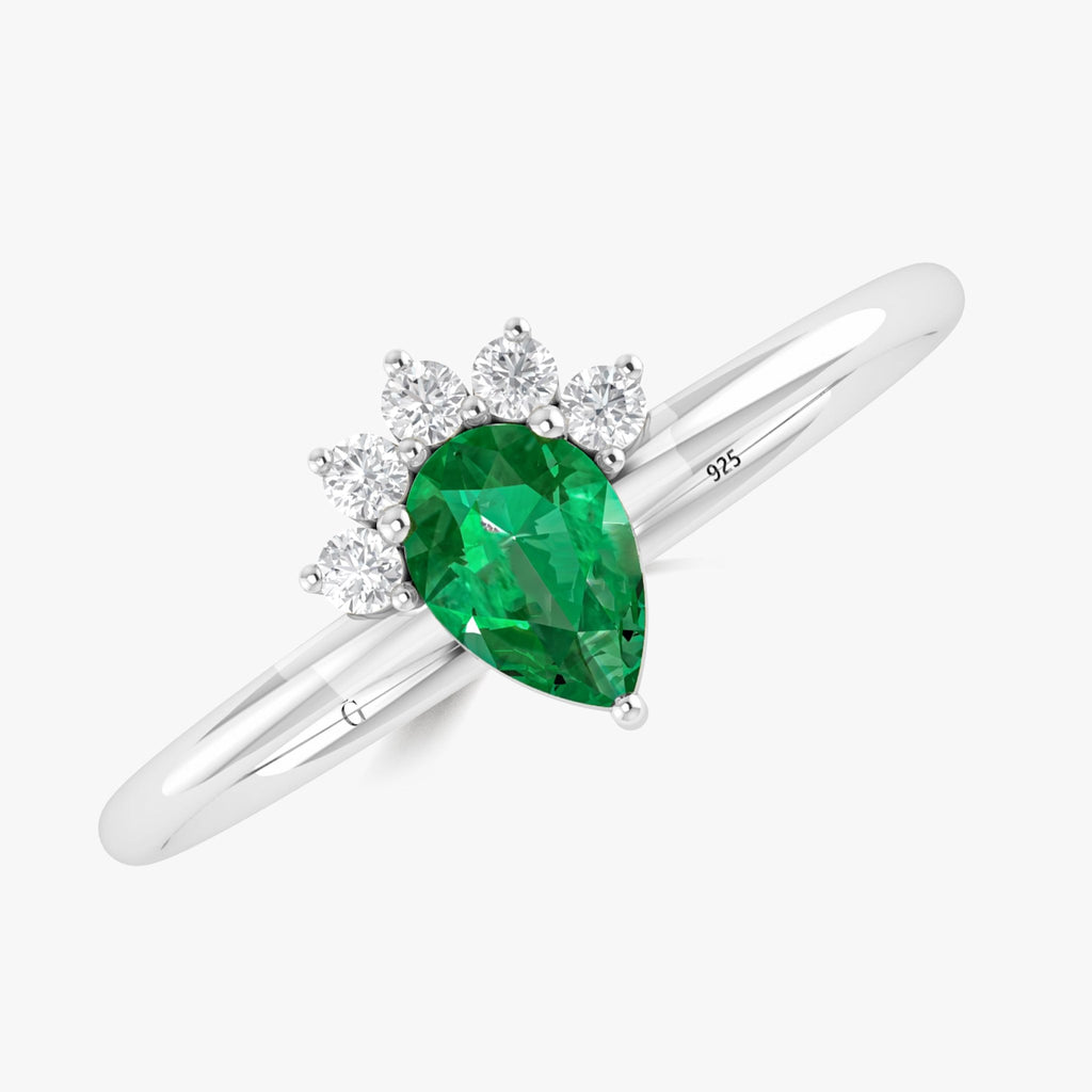 EmeraldThis beautiful ring features a vibrant green, pear-shaped lab-grown emerald gemstone. Sparkling round cubic zirconia diamonds add a touch of brightness. The ring is made of 925 sterling silver and is perfect for everyday wear or special occasions.