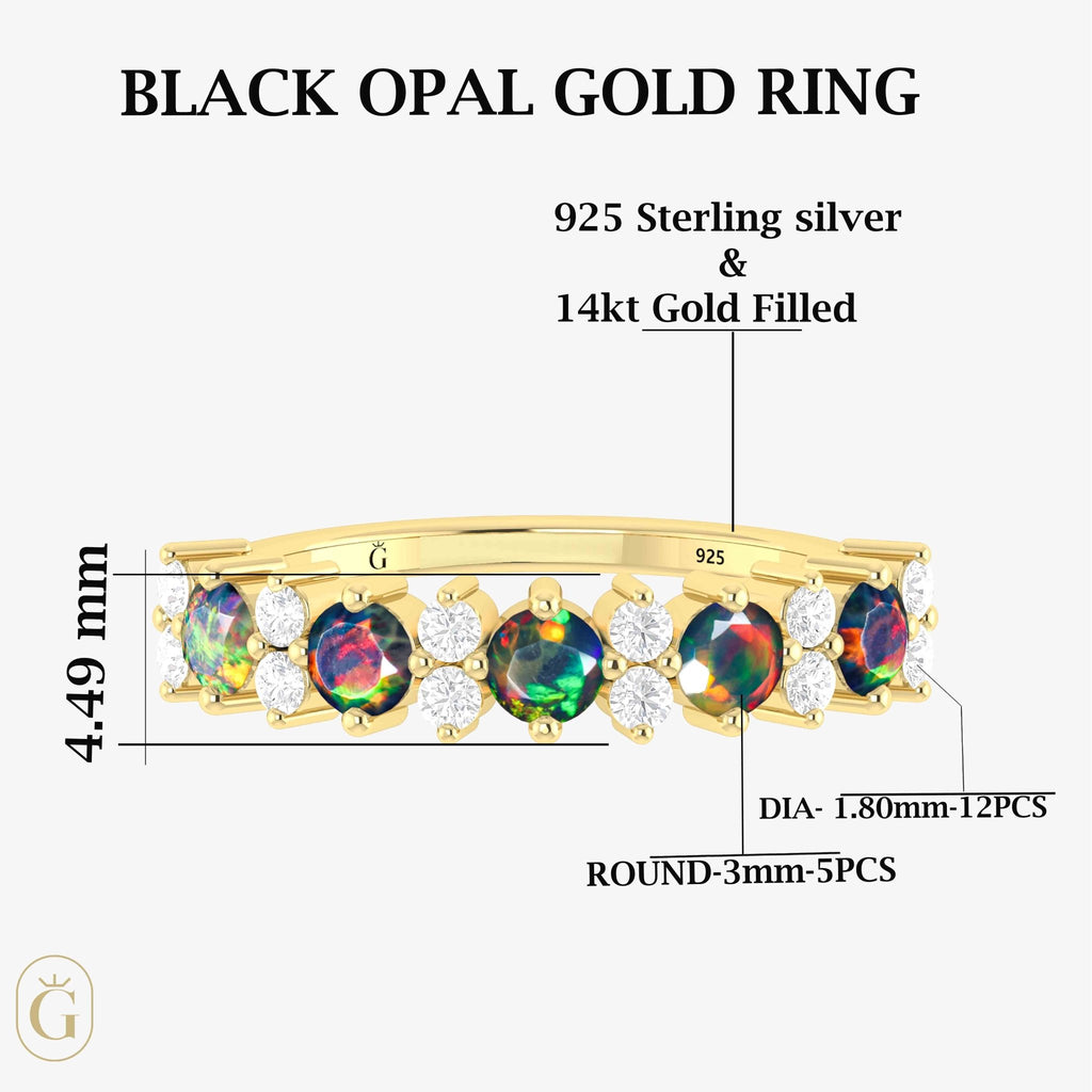 Natural Black Opal Half Eternity Ring for women. Handcrafted with attention to detail, this stunning ring features five 3mm round faceted natural black opals, totaling 1 carat, each reflecting a mesmerizing spectrum of colors. The opals are set in solid 925 sterling silver, delivering both durability and brilliance in one refined piece. The half eternity band design symbolizes never-ending love and commitment, making this ring the perfect choice for a variety of romantic occasions, from anniversaries and engagements to promise rings.