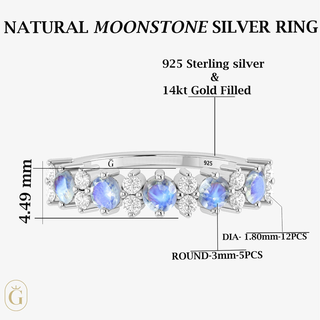 MoonstoneNatural Moonstone Half Eternity Ring for women. Handcrafted with attention to detail, this stunning ring features five 3mm round faceted natural Moonstones, totaling 1 carat, each reflecting a mesmerizing spectrum of colors. The Moonstones are set in solid 925 sterling silver, delivering both durability and brilliance in one refined piece. The half eternity band design symbolizes never-ending love and commitment, making this ring the perfect choice for a variety of romantic occasions, from anniversaries and engagements to promise rings.