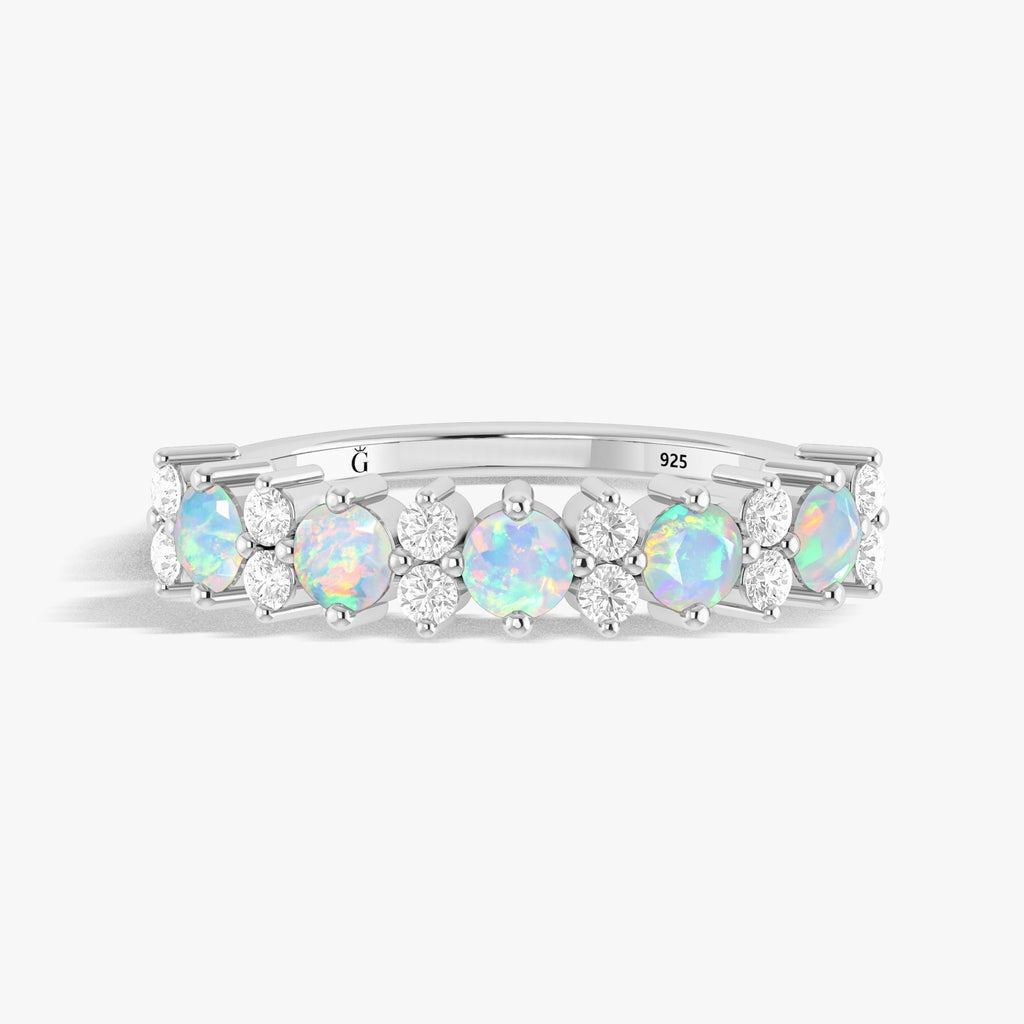 White OpalNatural White Opal Half Eternity Ring for women. Handcrafted with attention to detail, this stunning ring features five 3mm round faceted natural White Opals, totaling 1 carat, each reflecting a mesmerizing spectrum of colors. The White Opals are set in solid 925 sterling silver and finished with a luxurious yellow gold-filled overlay, delivering both durability and brilliance in one refined piece. The half eternity band design symbolizes never-ending love and commitment, making this ring the perfect choice for a variety of romantic occasions, from anniversaries and engagements to promise rings.