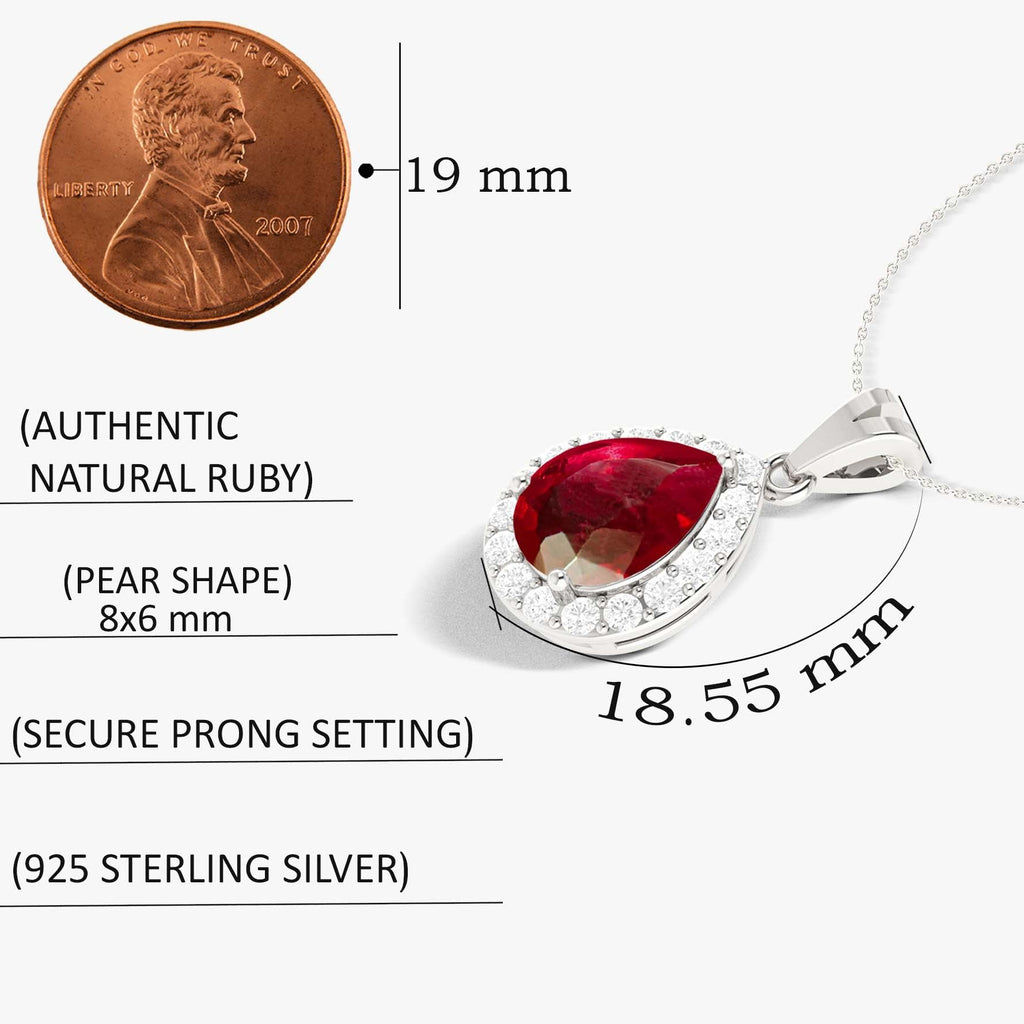 RubyGOODSTONE JEWELS Natural Ruby Halo Chain Pendant Necklace. This stunning piece features a unique gemstone ruby in an elegant 925 sterling silver necklace. The 8x6mm pear-shaped stones are delicately arranged to create a mesmerizing halo, making this necklace a true statement piece. Crafted with sterling silver, adding both sophistication and durability to the design. The 16" chain, with an additional 2" extender, ensures a perfect fit for most necklines, providing versatility and comfort for all-day wear. Weighing just 1.95 grams, this lightweight necklace offers the ideal balance of style and comfort. Whether you're dressing up for a special occasion or adding a touch of elegance to your everyday look, this necklace complements any ensemble effortlessly.