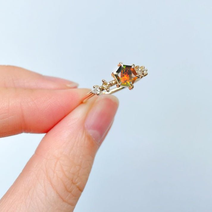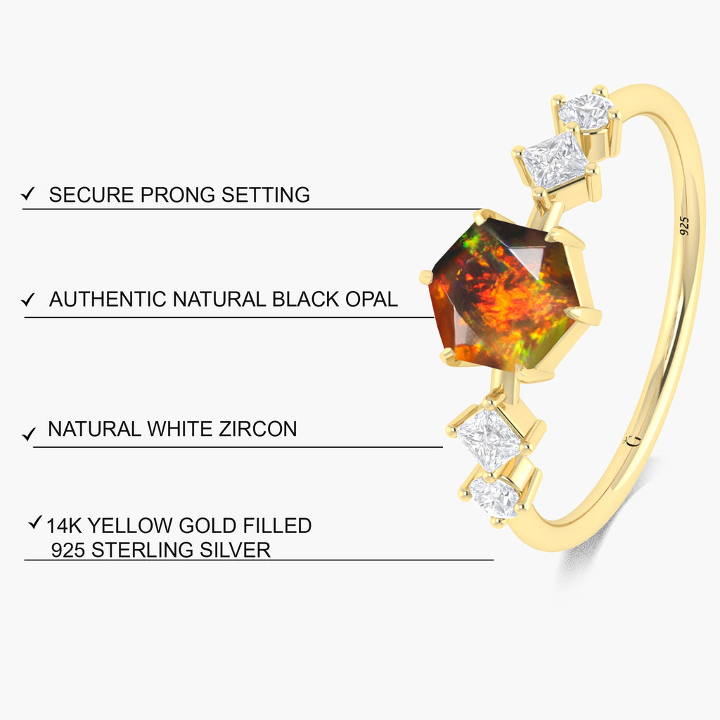 Black OpalNatural Black Opal Designer Ring for women. Expertly handcrafted in 925 Sterling Silver, this ring features a stunning 6MM Hexagon-Cut Black Opal, a rare gemstone known for its fiery brilliance and deep cosmic charm. The unique hexagon facet reflects light from every angle, making this ring a captivating choice for both everyday wear and special occasions. Whether you're shopping for an engagement ring, anniversary gift, promise ring, or birthday present, this meaningful piece is designed to impress.