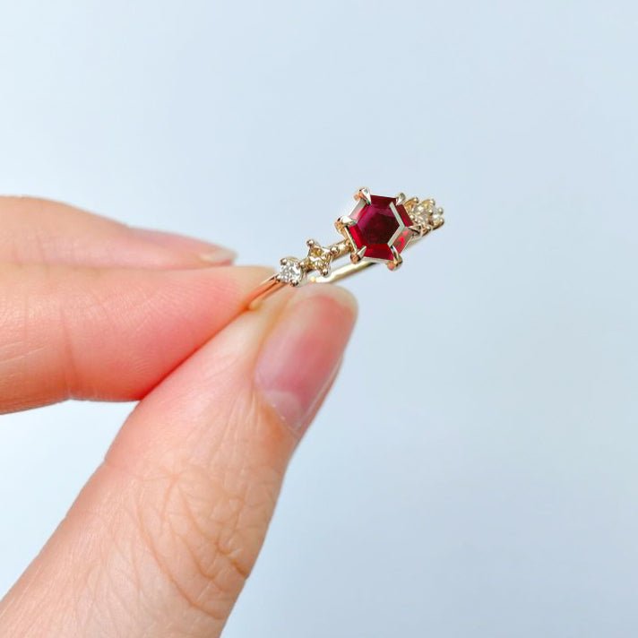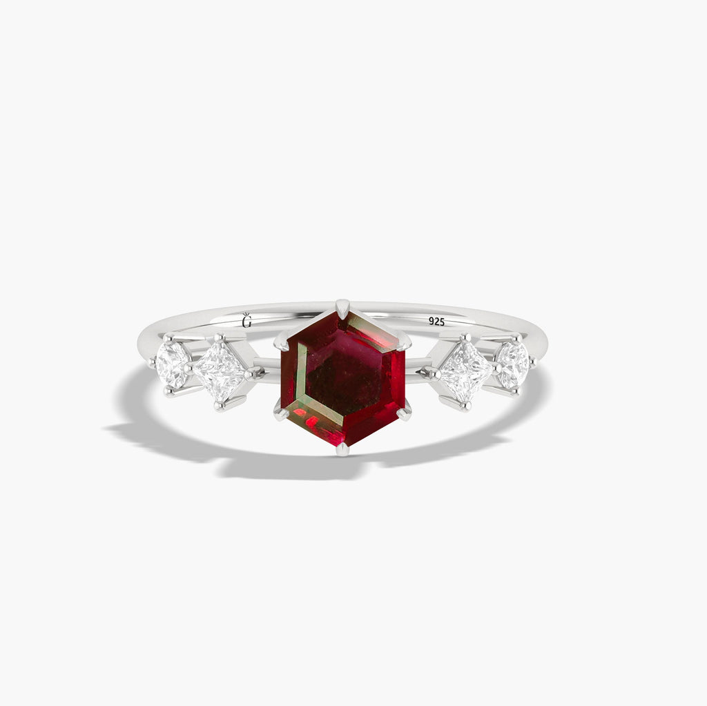 RubyNatural Ruby Designer Ring for women expertly handcrafted in 925 Sterling Silver and Yellow Gold Filled, this ring features a stunning 6MM Hexagon-Cut Ruby, a rare gemstone known for its fiery brilliance and deep cosmic charm. The unique hexagon facet reflects light from every angle, making this ring a captivating choice for both everyday wear and special occasions. Whether you're shopping for an engagement ring, anniversary gift, promise ring, or birthday present, this meaningful piece is designed to impress.