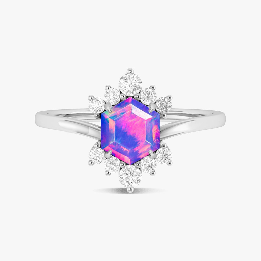 Lavender OpalThis exquisite Natural Lavender Opal Halo Ring is meticulously handcrafted for the modern woman who cherishes both uniqueness and sophistication. At the heart of this stunning piece lies a 6mm hexagon-cut Lavender Opal (1.0 carat), known for its mesmerizing fire and color play. Solid 925 sterling silver ring offers a striking contrast that enhances the Lavender Opal’s brilliance, making it a show-stopper for any occasion. The halo setting is designed to maximize light reflection, giving the gemstone an extra sparkle that symbolizes everlasting love.
