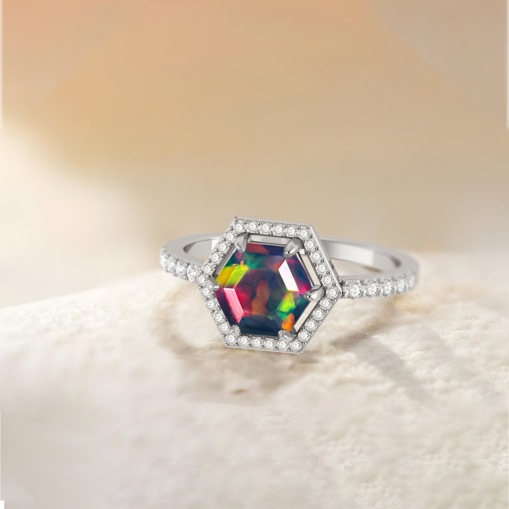 Black OpalNatural Black Opal 925 Sterling Silver Halo Ring. This stunning piece features a genuine 7mm hexagon-cut natural opal, expertly set in a solid 925 sterling silver band with a luxurious yellow gold-filled finish. The vibrant red hue of the 1.5-carat ruby adds a bold pop of color, while the geometric hexagon shape gives the ring a modern yet classic appeal. Crafted for women who appreciate both style and substance, this ring weighs approximately 3.60 grams and measures 11.20 mm in width, offering a comfortable fit without compromising on Halo appeal. Whether worn as an everyday accessory or reserved for special occasions, this ring complements every wardrobe with sophistication. Opal is known as the birthstone for July, symbolizing love, passion, and strength.