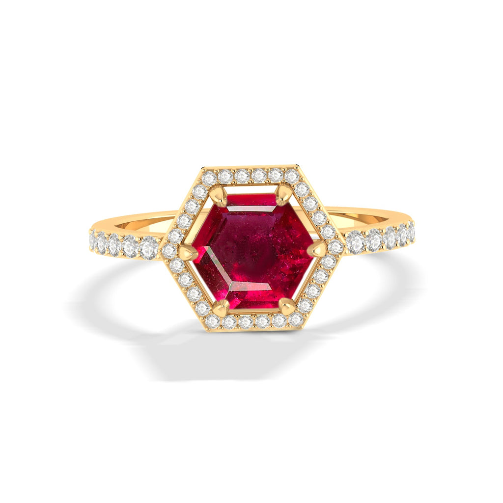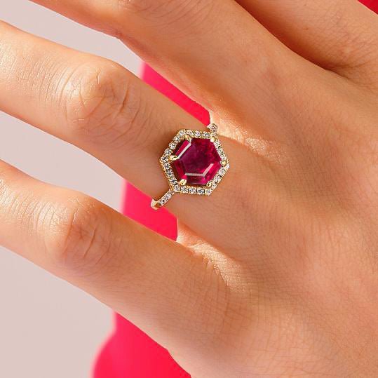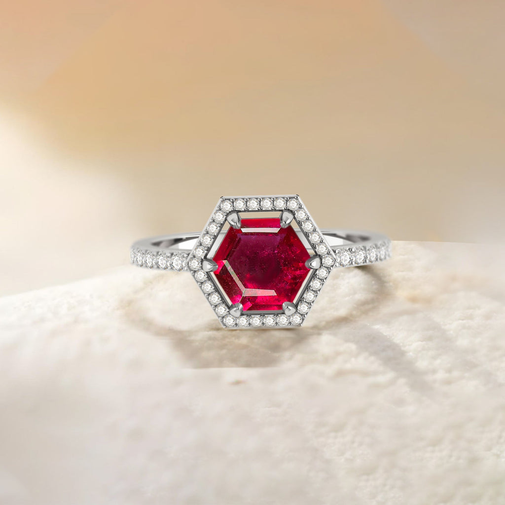 RubyNatural Ruby 925 Sterling Silver Halo Ring. This stunning piece features a genuine 7mm hexagon-cut natural ruby, expertly set in a solid 925 sterling silver band. The vibrant red hue of the 1.5-carat ruby adds a bold pop of color, while the geometric hexagon shape gives the ring a modern yet classic appeal. Crafted for women who appreciate both style and substance, this ring weighs approximately 3.60 grams and measures 11.20 mm in width, offering a comfortable fit without compromising on Halo appeal. Whether worn as an everyday accessory or reserved for special occasions, this ring complements every wardrobe with sophistication. Ruby is known as the birthstone for July, symbolizing love, passion, and strength.