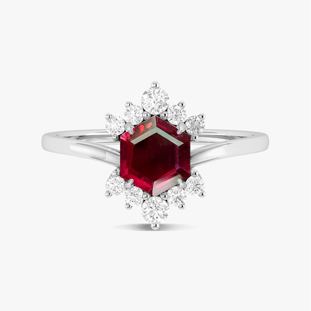 RubyThis exquisite Natural Ruby Halo Ring is meticulously handcrafted for the modern woman who cherishes both uniqueness and sophistication. At the heart of this stunning piece lies a 6mm hexagon-cut Ruby (1.0 carat), known for its mesmerizing fire and color play. Set in solid 925 sterling silver and luxuriously yellow gold filled, this ring offers a striking contrast that enhances the Ruby’s brilliance, making it a show-stopper for any occasion. The halo setting is designed to maximize light reflection, giving the gemstone an extra sparkle that symbolizes everlasting love.