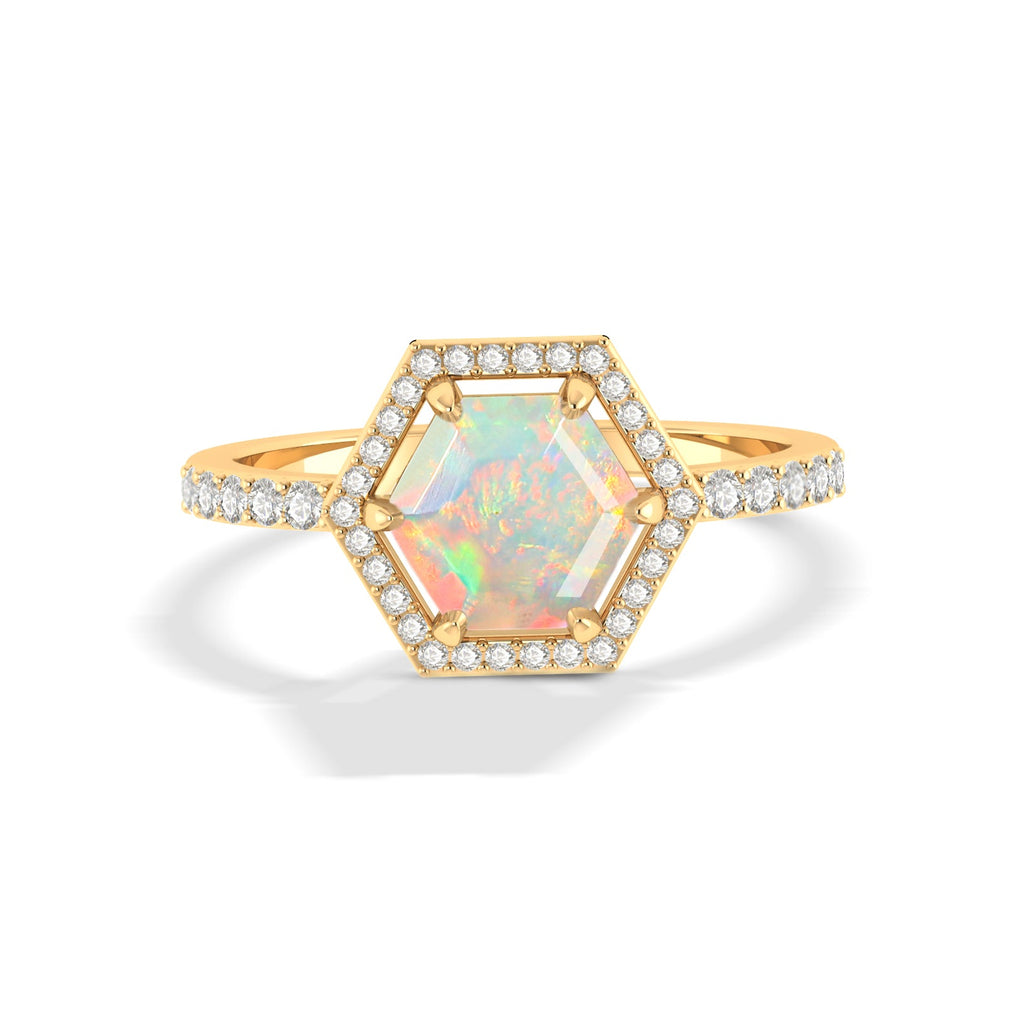 White OpalNatural White Opal 925 Sterling Silver Halo Ring. This stunning piece features a genuine 7mm hexagon-cut natural opal, expertly set in a solid 925 sterling silver band with a luxurious yellow gold-filled finish. The vibrant red hue of the 1.5-carat ruby adds a bold pop of color, while the geometric hexagon shape gives the ring a modern yet classic appeal. Crafted for women who appreciate both style and substance, this ring weighs approximately 3.60 grams and measures 11.20 mm in width, offering a comfortable fit without compromising on Halo appeal. Whether worn as an everyday accessory or reserved for special occasions, this ring complements every wardrobe with sophistication. Opal is known as the birthstone for July, symbolizing love, passion, and strength.