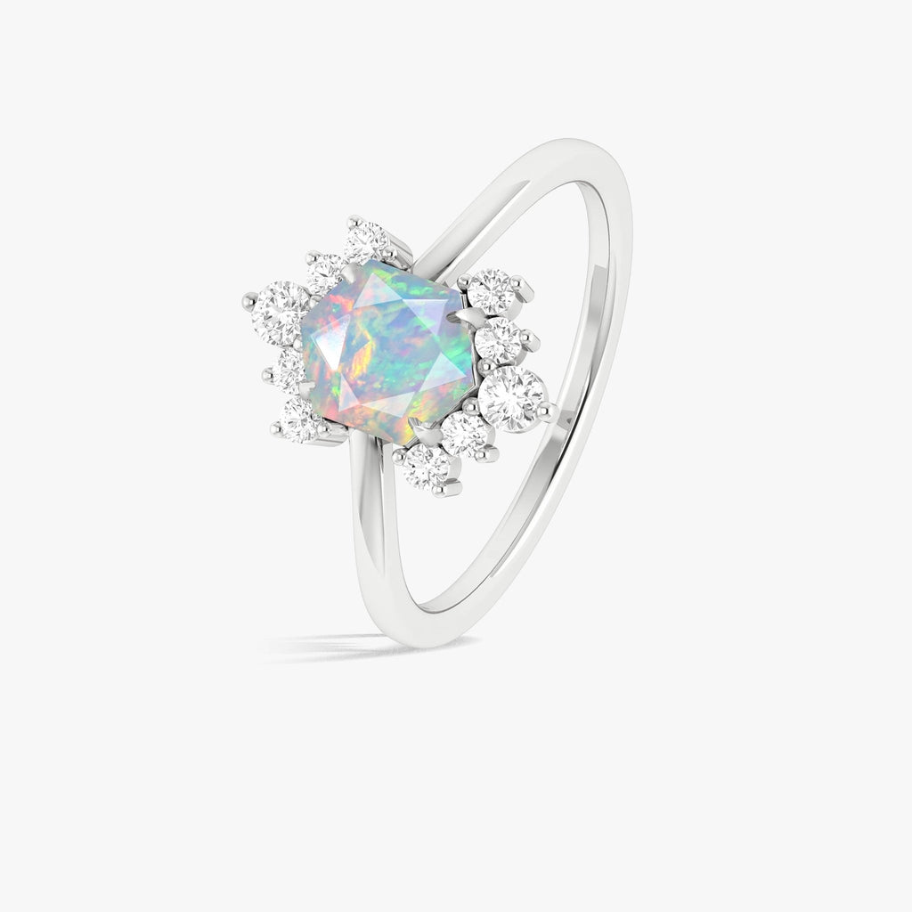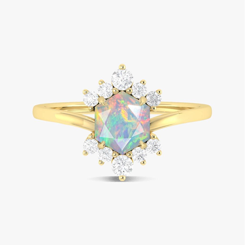 White OpalThis exquisite Natural White Opal Halo Ring is meticulously handcrafted for the modern woman who cherishes both uniqueness and sophistication. At the heart of this stunning piece lies a 6mm hexagon-cut White Opal (1.0 carat), known for its mesmerizing fire and color play. Set in solid 925 sterling silver and luxuriously yellow gold filled, this ring offers a striking contrast that enhances the White Opal’s brilliance, making it a show-stopper for any occasion. The halo setting is designed to maximize light reflection, giving the gemstone an extra sparkle that symbolizes everlasting love.