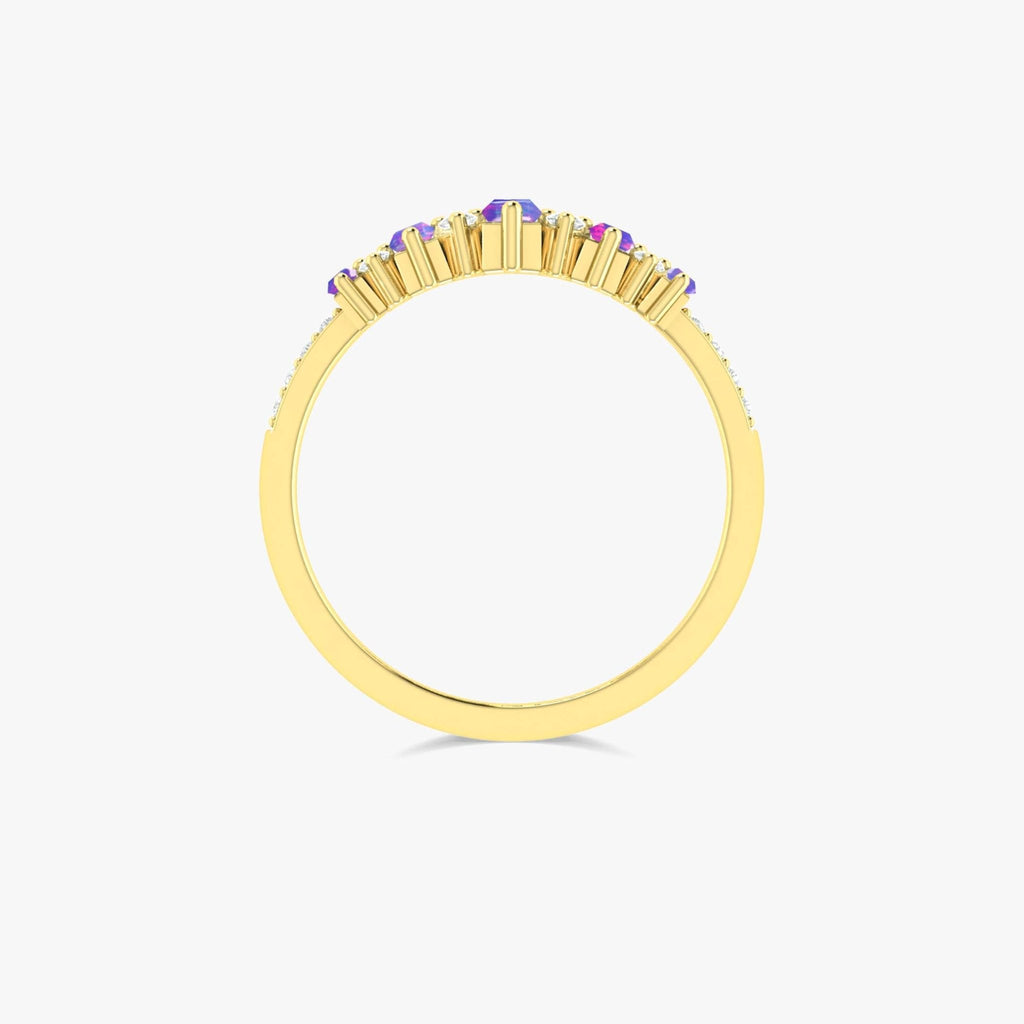 Lavender OpalThis ring features a beautiful baguette -shaped Ethiopian Opal with a soft, classic glowing look. Sparkling round cubic zirconia diamonds add a touch of sparkle. The ring is made of sterling silver and is perfect for everyday wear or special occasions.