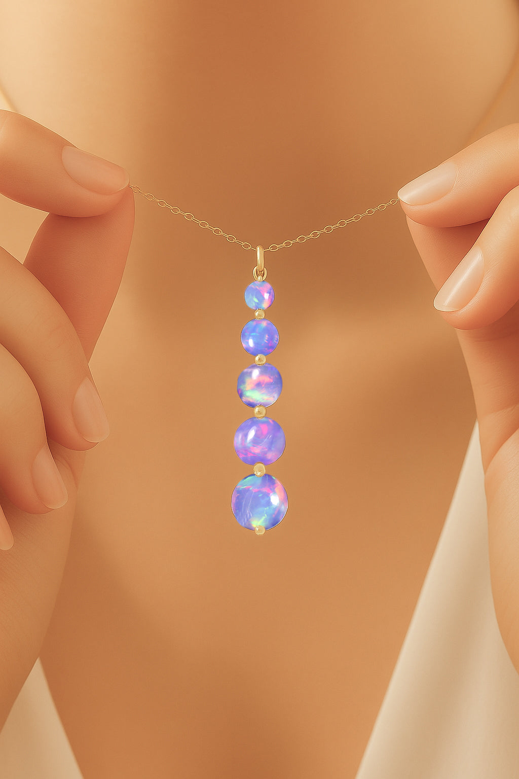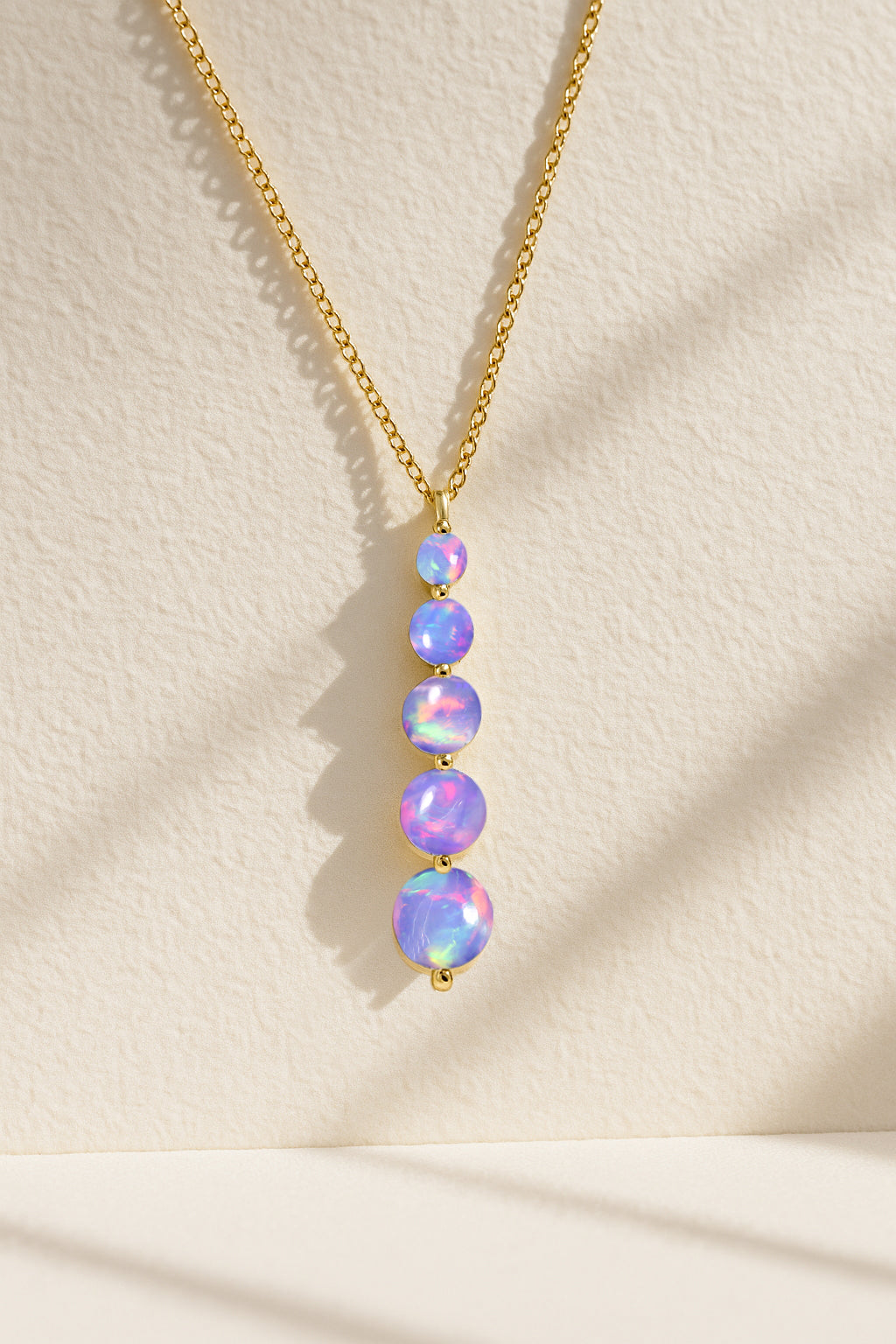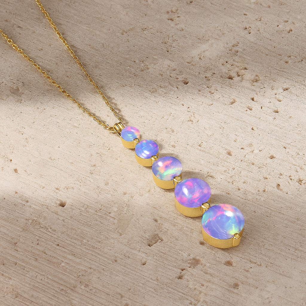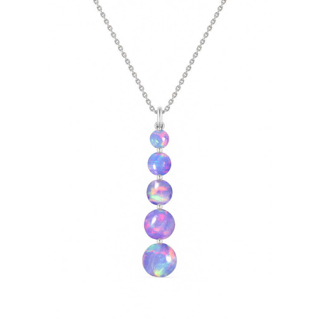 Lavender OpalThis Lavender Opal 5-Stone Bar Pendant Necklace is crafted in genuine 925 Sterling Silver for a soft and elegant look. Featuring five round lavender opal stones ranging from 3mm to 7mm, it offers a total gemstone weight of 3.05 carats in a sleek vertical design. The pendant measures 34.75 × 7.30 mm and is paired with a 16” cable chain plus 2” extender, secured with a lobster clasp. Perfect for everyday wear, special occasions, or gifting.