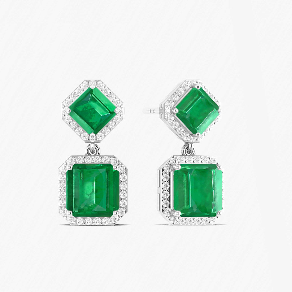 EmeraldStriking emerald 7x5mm octagon halo drop earrings crafted in 925 sterling silver, featuring 4ct of rich, vibrant emeralds with a sparkling halo. Measuring 20.9x10mm with secure push-back closure. Perfect for special occasions or adding a luxurious touch to any outfit.
