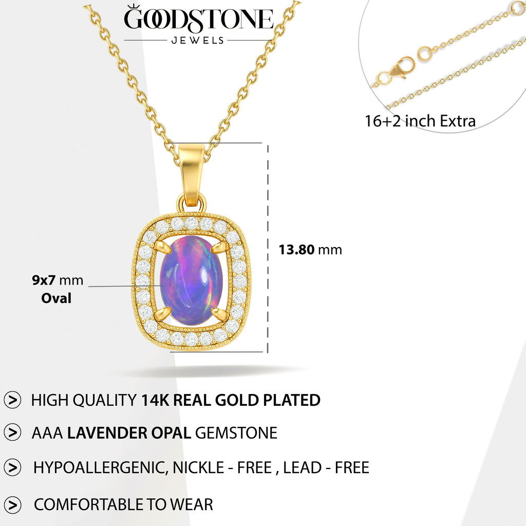 Lavender OpalElevate your style with this elegant Lavender Opal Oval Halo Pendant Necklace, crafted in premium 925 Sterling Silver. The smooth 9x7 mm opal (1.2 carat) sits beautifully within a classic halo frame, offering a radiant and timeless look. Measuring 12.80 x 11.80 mm, it comes with a 16" + 2" adjustable cable chain and secure lobster clasp. Lightweight at 1.65 g, this pendant adds a graceful touch to both everyday wear and special occasions. Perfect for gifting or personal elegance.