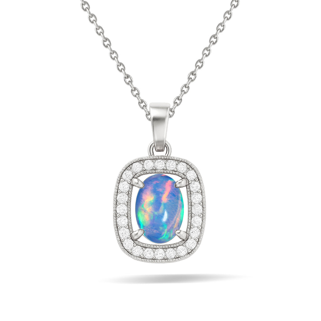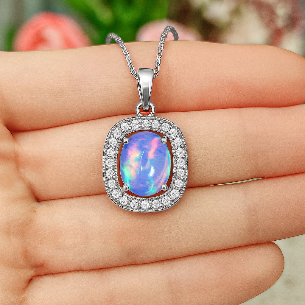 Blue OpalElevate your style with this elegant Blue Opal Oval Halo Pendant Necklace, crafted in premium 925 Sterling Silver. The smooth 9x7 mm opal (1.2 carat) sits beautifully within a classic halo frame, offering a radiant and timeless look. Measuring 12.80 x 11.80 mm, it comes with a 16" + 2" adjustable cable chain and secure lobster clasp. Lightweight at 1.65 g, this pendant adds a graceful touch to both everyday wear and special occasions. Perfect for gifting or personal elegance.