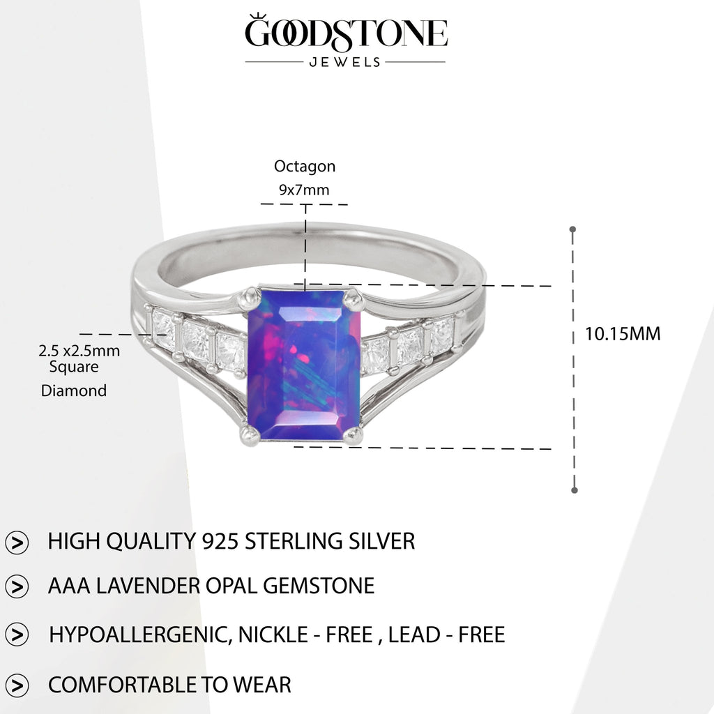 Lavender OpalMake a bold statement with this stunning Opal Gemstone Ring. Featuring a vibrant AAA natural opal (9x7mm octagon cut) at the center, this ring is accented with sparkling square diamonds on each side, adding brilliance and sophistication to its design.