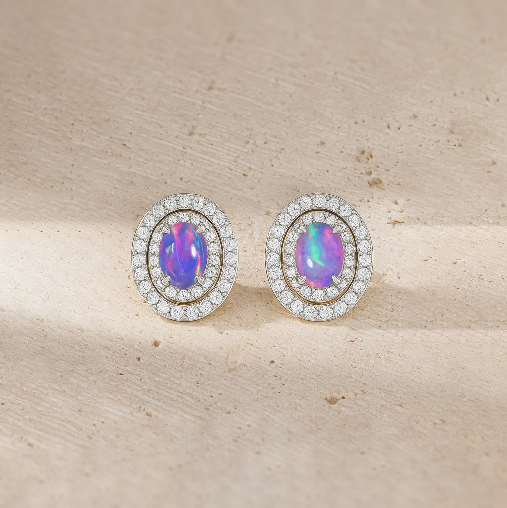 Lavender OpalBring timeless elegance to your style with these exquisite lavender opal stud earrings. Expertly crafted in high-quality 925 sterling silver, each earring features a brilliant AAA lavender opal gemstone (7x5mm oval cut) surrounded by two sparkling halos of round zircon stones for a radiant finish.