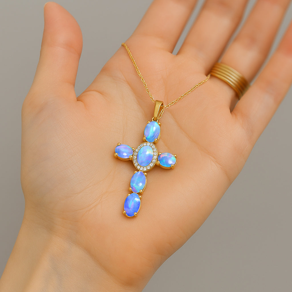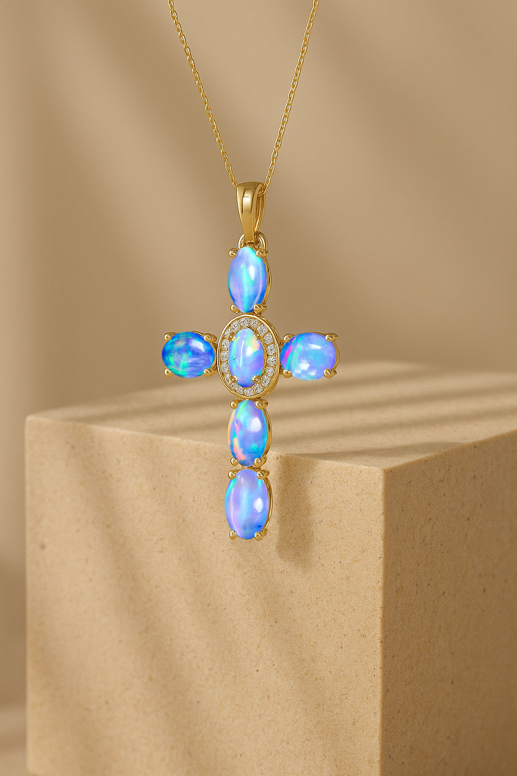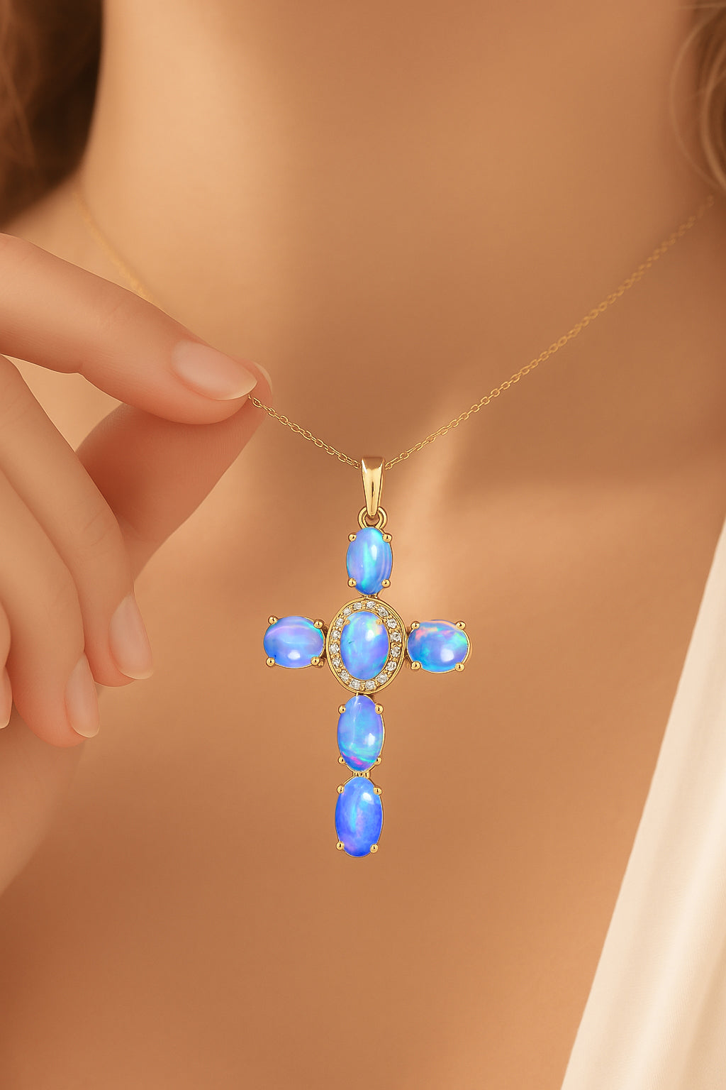 Blue OpalElevate your spiritual style with this exquisite Blue Opal Oval Holy Cross Pendant Necklace, beautifully crafted in 925 Sterling Silver for timeless elegance. Featuring a luminous 6x4 mm smooth oval Blue Opal totaling 2.40 carats, the pendant showcases a radiant cross design measuring 34.19 x 19.98 mm, offering a graceful blend of devotion and sophistication. Suspended on a 16" + 2" adjustable cable chain with a secure lobster clasp, this 3.50 gm approx necklace is perfect for daily wear, gifting, or meaningful occasions. A luxurious statement piece for women who appreciate spiritual jewelry with a refined, modern touch.