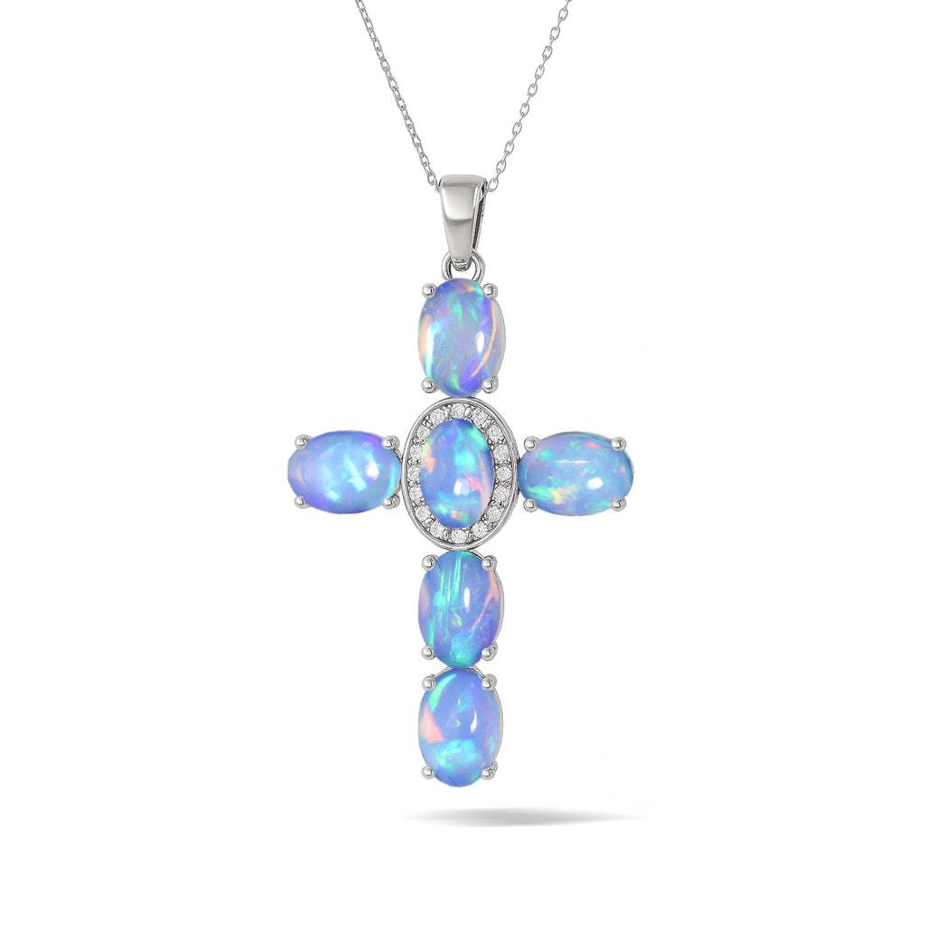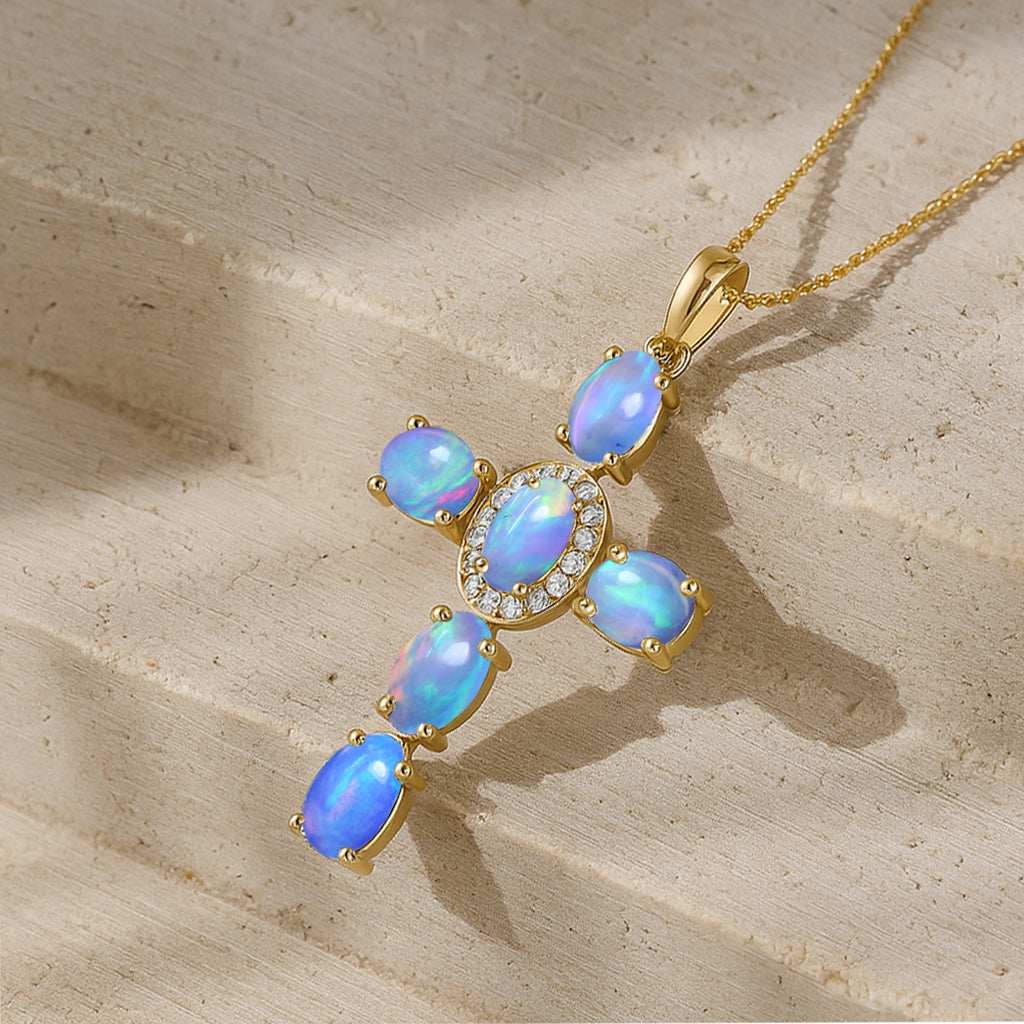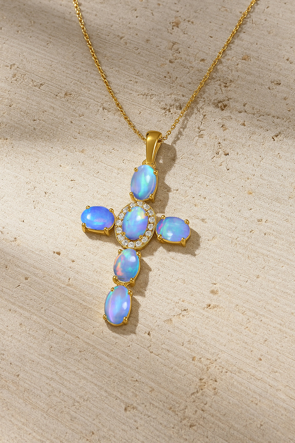 Blue OpalElevate your spiritual style with this exquisite Blue Opal Oval Holy Cross Pendant Necklace, beautifully crafted in 925 Sterling Silver for timeless elegance. Featuring a luminous 6x4 mm smooth oval Blue Opal totaling 2.40 carats, the pendant showcases a radiant cross design measuring 34.19 x 19.98 mm, offering a graceful blend of devotion and sophistication. Suspended on a 16" + 2" adjustable cable chain with a secure lobster clasp, this 3.50 gm approx necklace is perfect for daily wear, gifting, or meaningful occasions. A luxurious statement piece for women who appreciate spiritual jewelry with a refined, modern touch.
