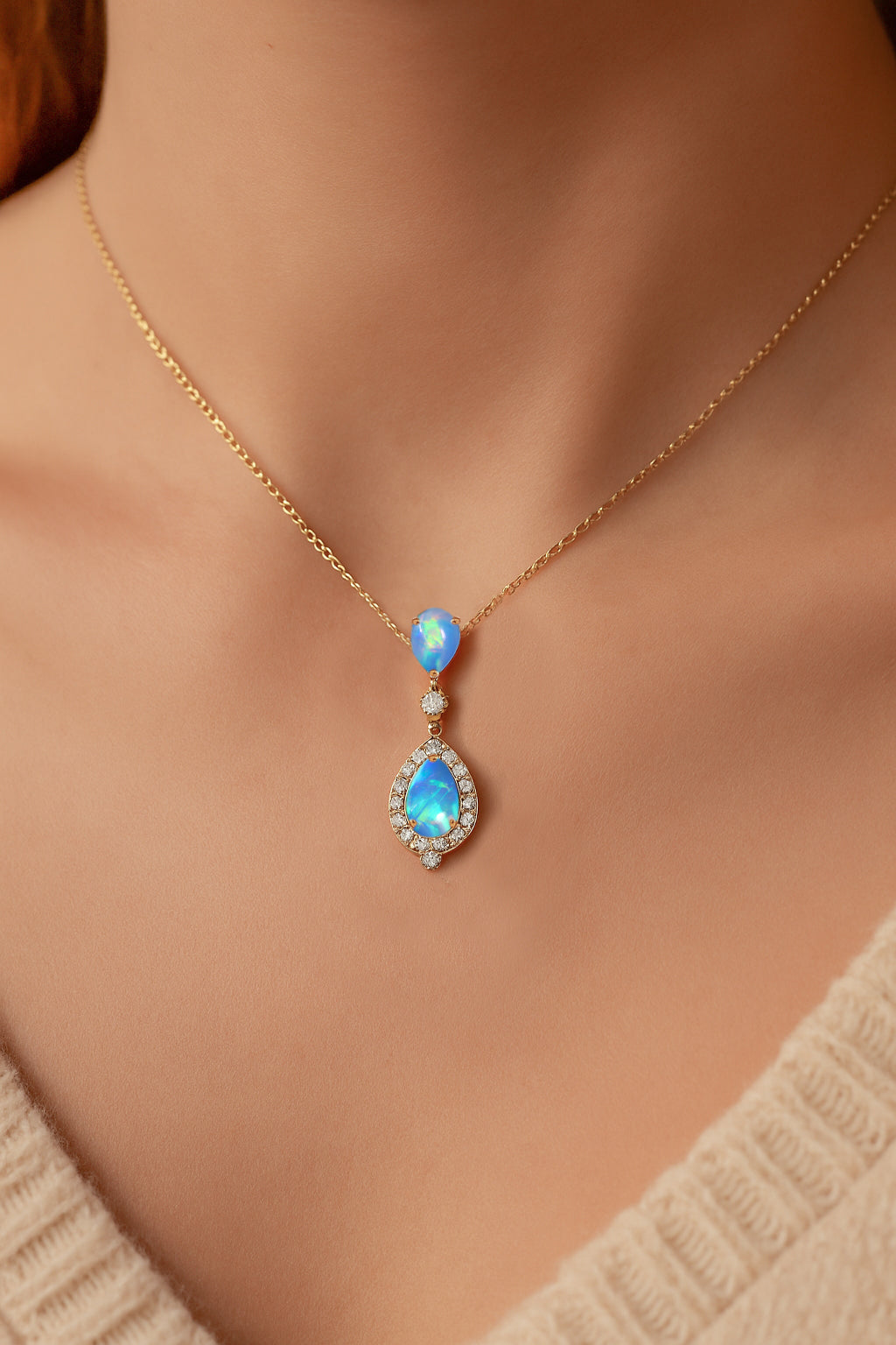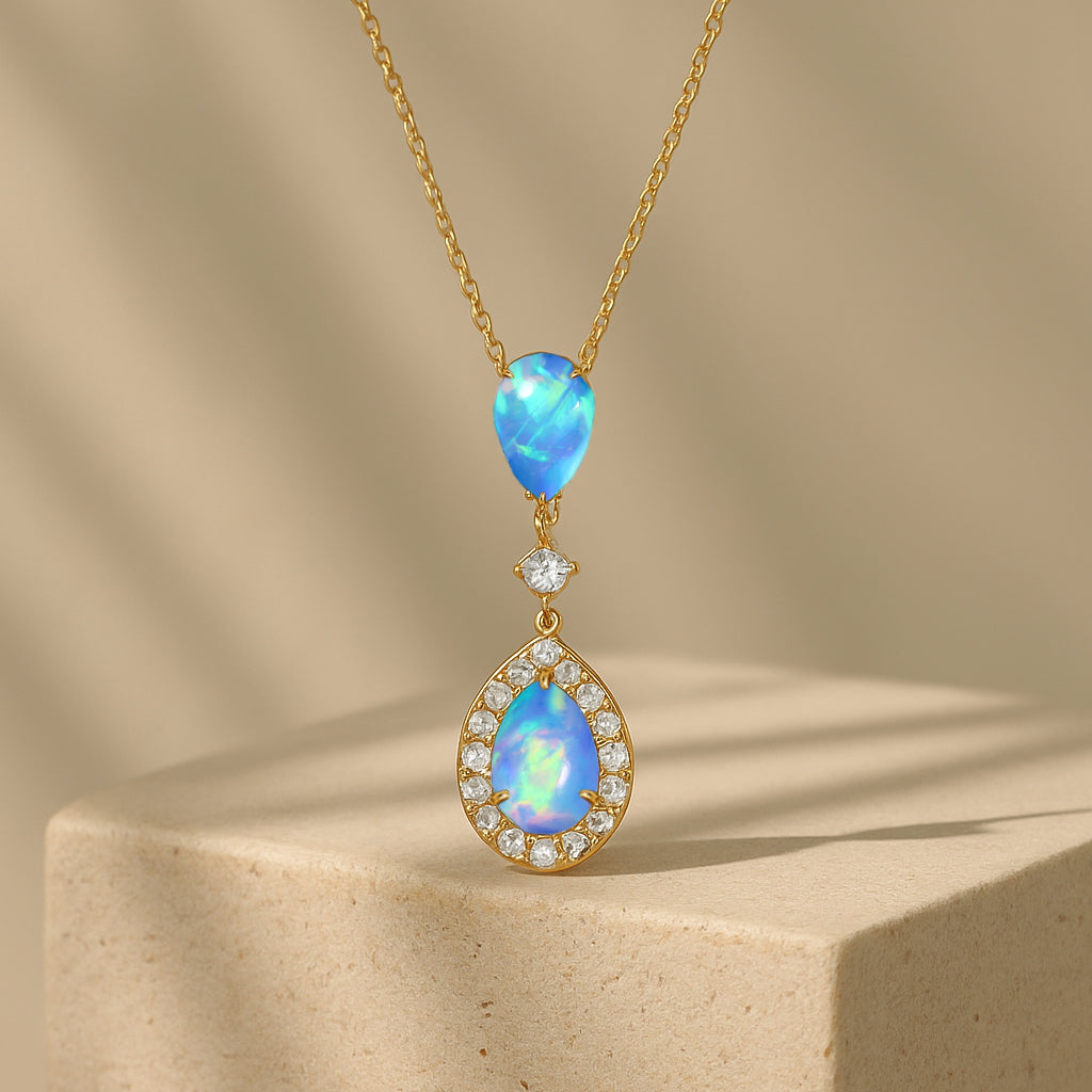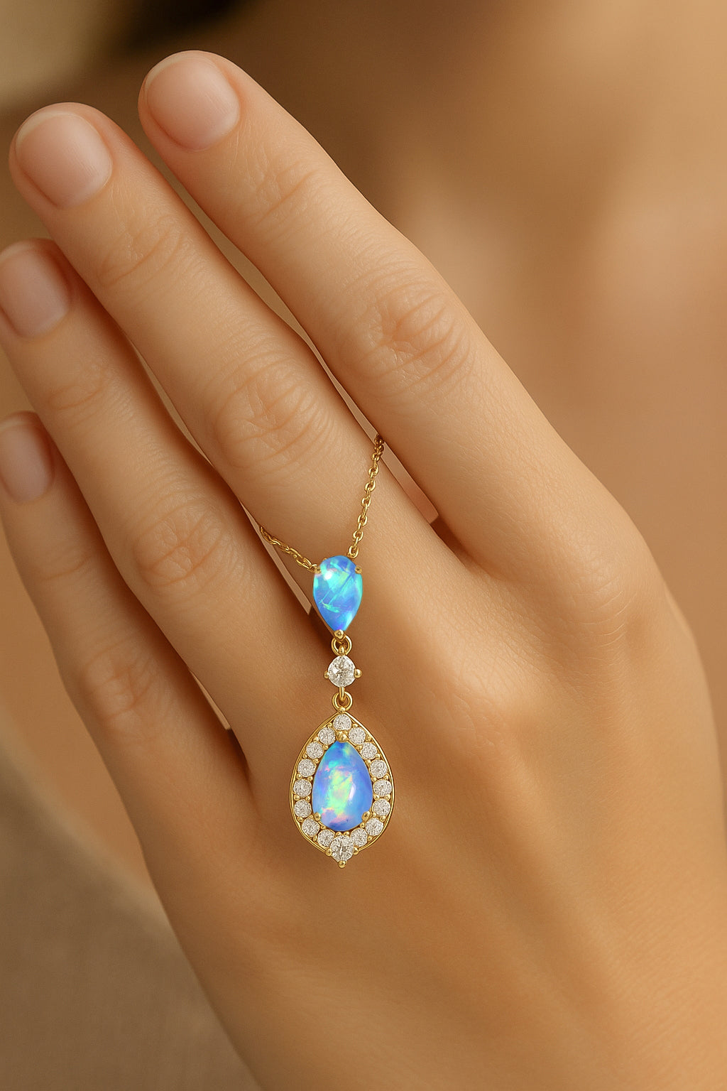 Blue OpalElevate your look with this stunning Blue Opal Pear Halo Pendant Necklace crafted in premium 925 sterling silver. Featuring a smooth 7x5 mm pear-shaped opal accented with a 6x4 mm halo stone, the pendant offers a luminous 1.0 carat brilliance. Its elegant 25.30x8.30 mm design hangs beautifully from a 16"+2" cable chain secured with a lobster clasp. Weighing approximately 2.30 gm, this necklace blends timeless charm with modern elegance, perfect for both daily wear and special occasions.