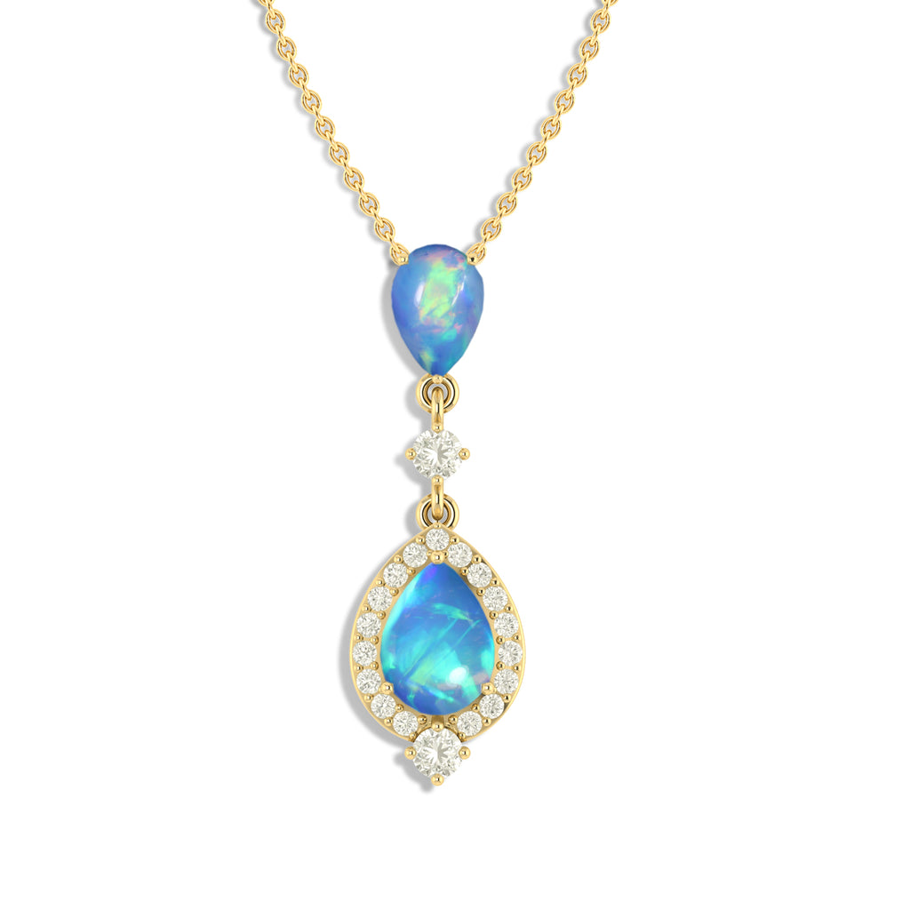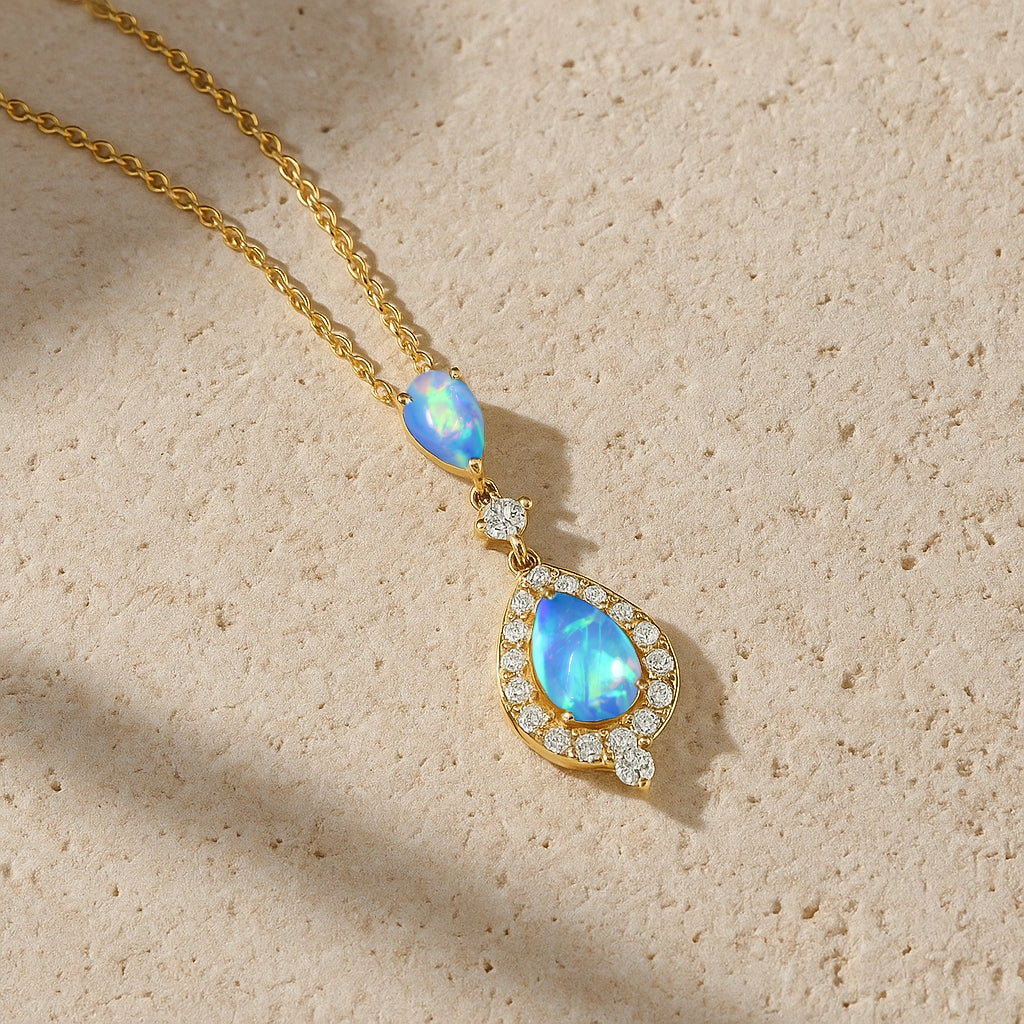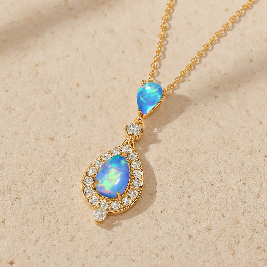 Blue OpalElevate your look with this stunning Blue Opal Pear Halo Pendant Necklace crafted in premium 925 sterling silver. Featuring a smooth 7x5 mm pear-shaped opal accented with a 6x4 mm halo stone, the pendant offers a luminous 1.0 carat brilliance. Its elegant 25.30x8.30 mm design hangs beautifully from a 16"+2" cable chain secured with a lobster clasp. Weighing approximately 2.30 gm, this necklace blends timeless charm with modern elegance, perfect for both daily wear and special occasions.