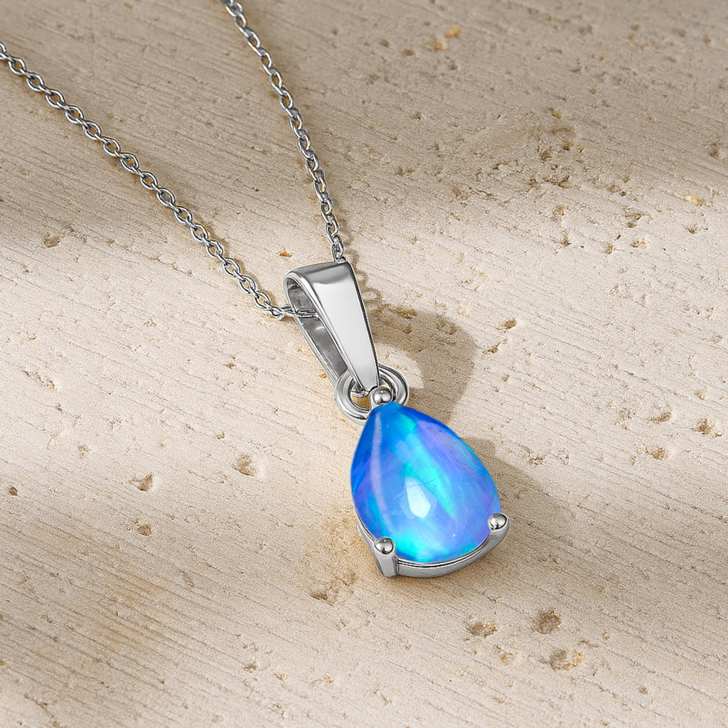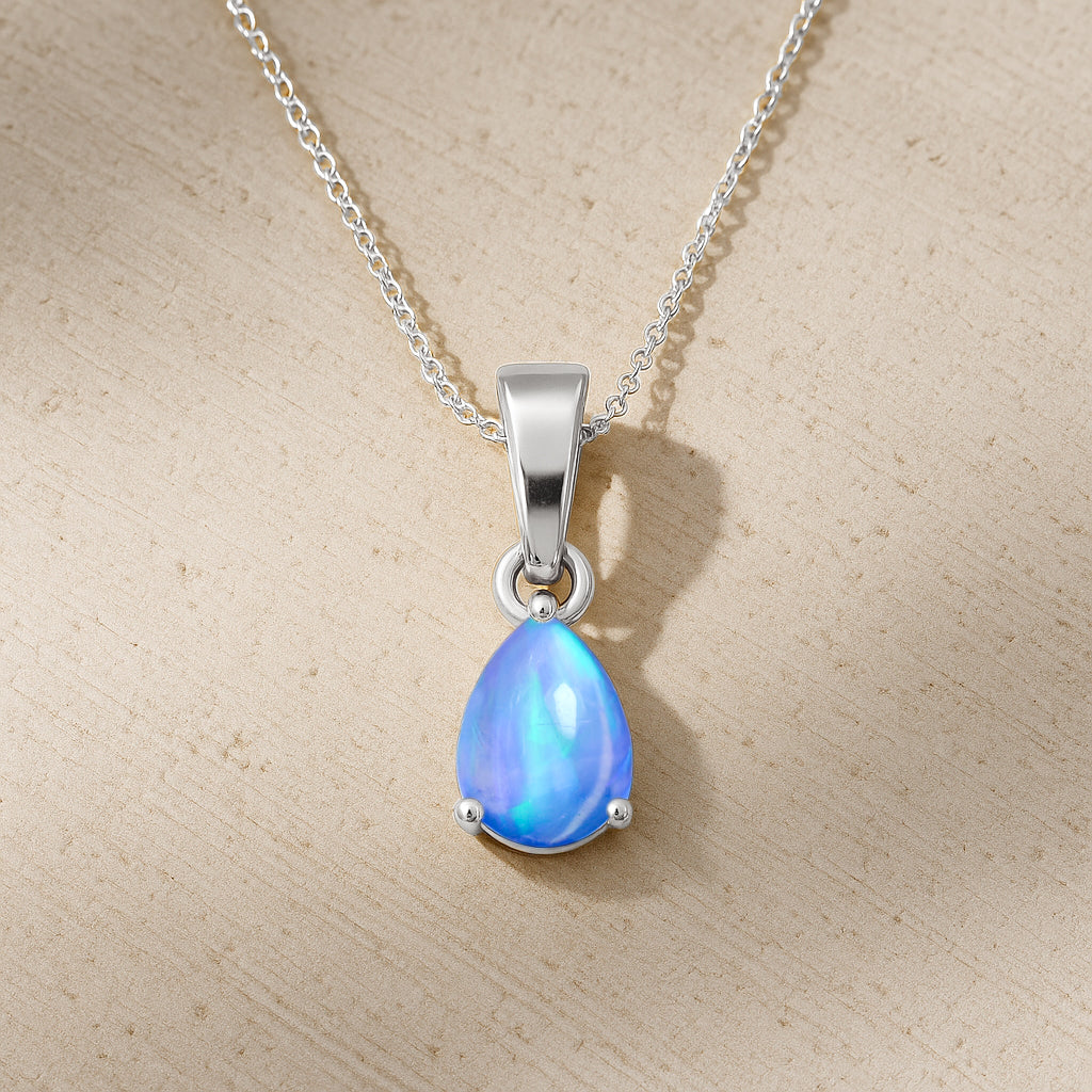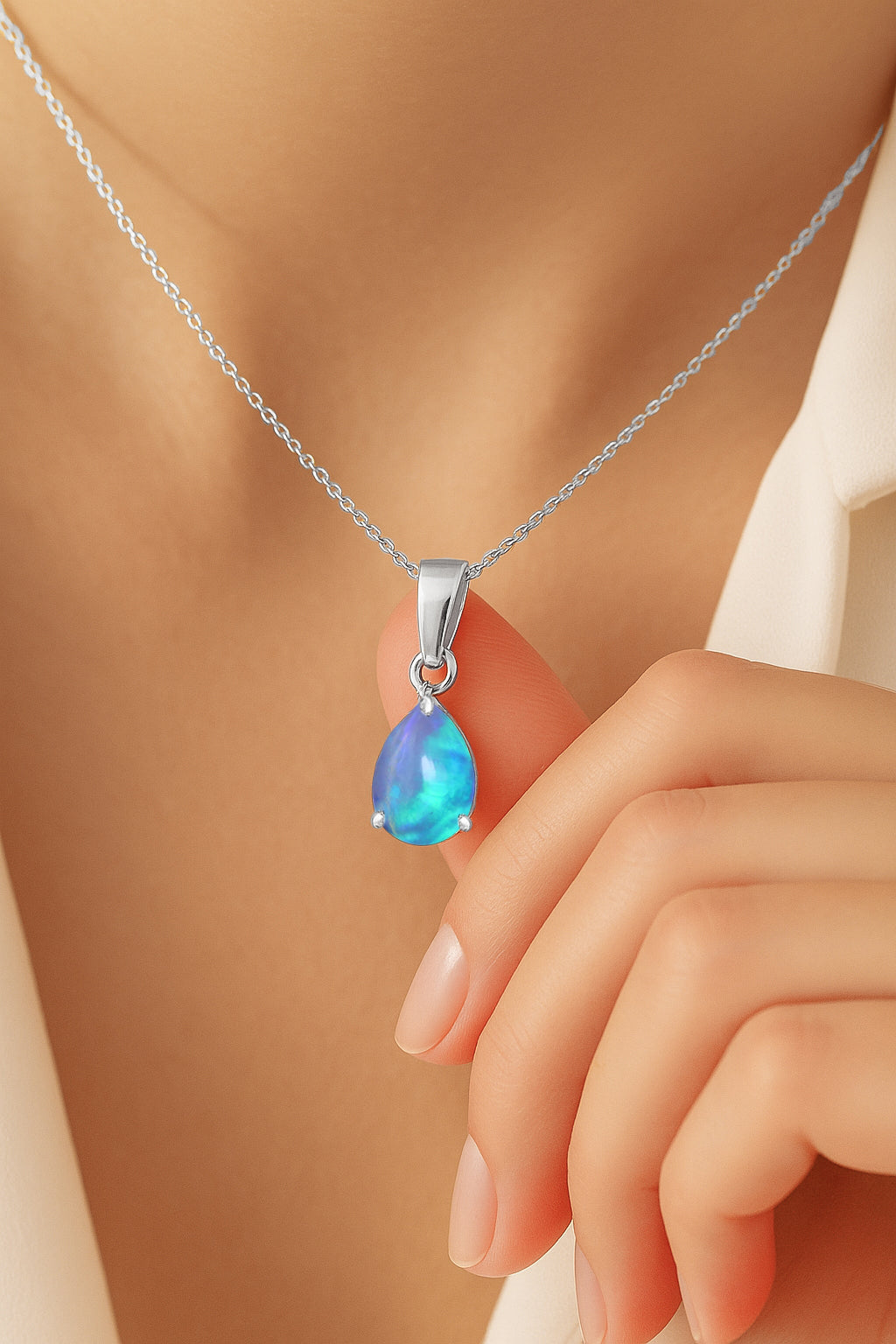 Blue OpalEnhance your style with this elegant Blue Opal Pear Teardrop Pendant Necklace, crafted in fine 925 sterling silver. The pendant features a smooth 9×7 mm pear-cut opal weighing 1.20 carat, celebrated for its luminous, iridescent glow. Measuring 18.40×7.00 mm, it hangs beautifully from a 16″ + 2″ adjustable cable chain. With an approximate weight of 1.35 g, this lightweight yet striking piece adds a touch of soft radiance to both everyday looks and special occasions.