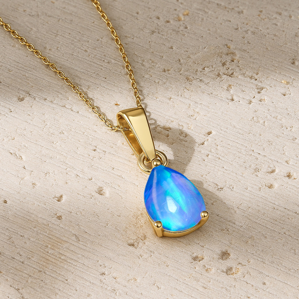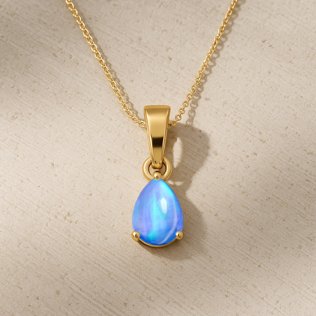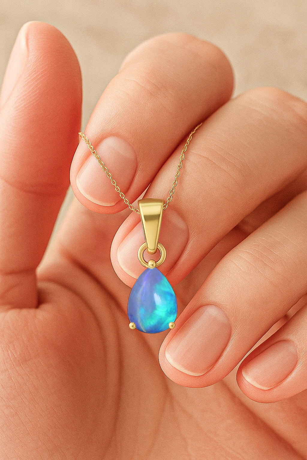 Blue OpalEnhance your style with this elegant Blue Opal Pear Teardrop Pendant Necklace, crafted in fine 925 sterling silver. The pendant features a smooth 9×7 mm pear-cut opal weighing 1.20 carat, celebrated for its luminous, iridescent glow. Measuring 18.40×7.00 mm, it hangs beautifully from a 16″ + 2″ adjustable cable chain. With an approximate weight of 1.35 g, this lightweight yet striking piece adds a touch of soft radiance to both everyday looks and special occasions.