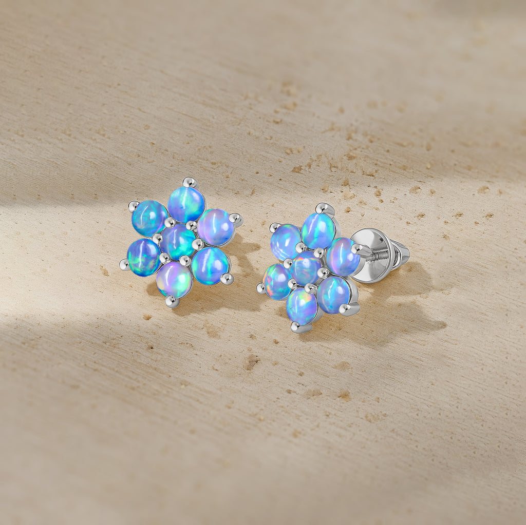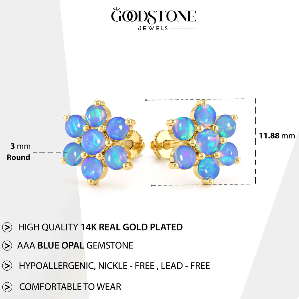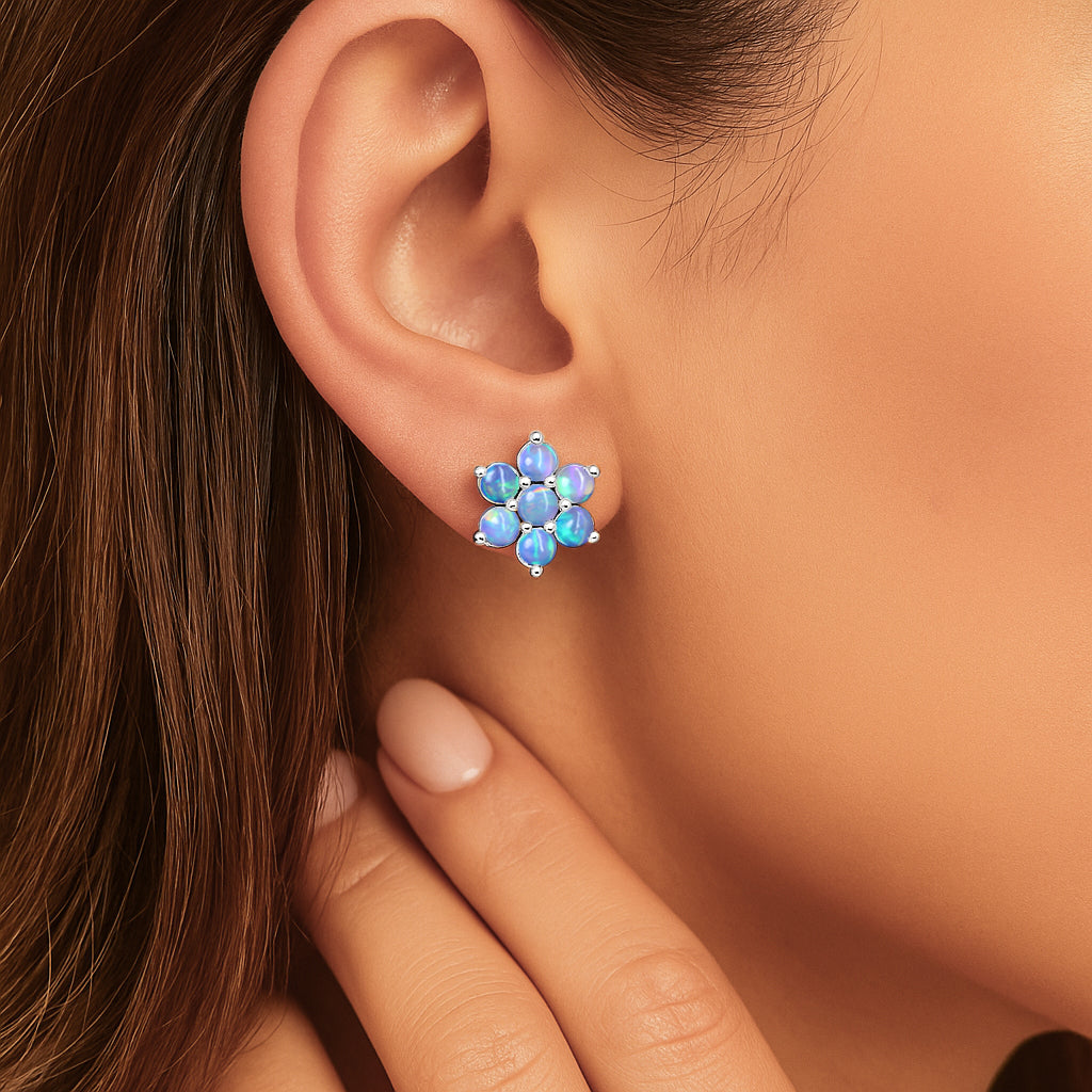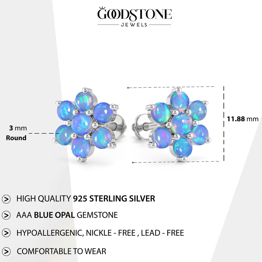 Blue OpalElevate your everyday elegance with these Blue Opal Round Stone Stud Earrings, beautifully crafted in 925 Sterling Silver. Featuring 14 smooth 3 mm round opal stones totaling 2.80 carats, each earring reflects a soft iridescent glow that enhances any look from casual chic to refined evening wear. With a size of 11.88 x 10.46 mm and a solid 3.60 gm build, these studs offer both durability and luxury. The high polish silver setting enhances the natural fire of the opal, making this pair a perfect gift for birthdays, anniversaries, or opal lovers. A timeless, luminous addition to your fine jewelry collection.