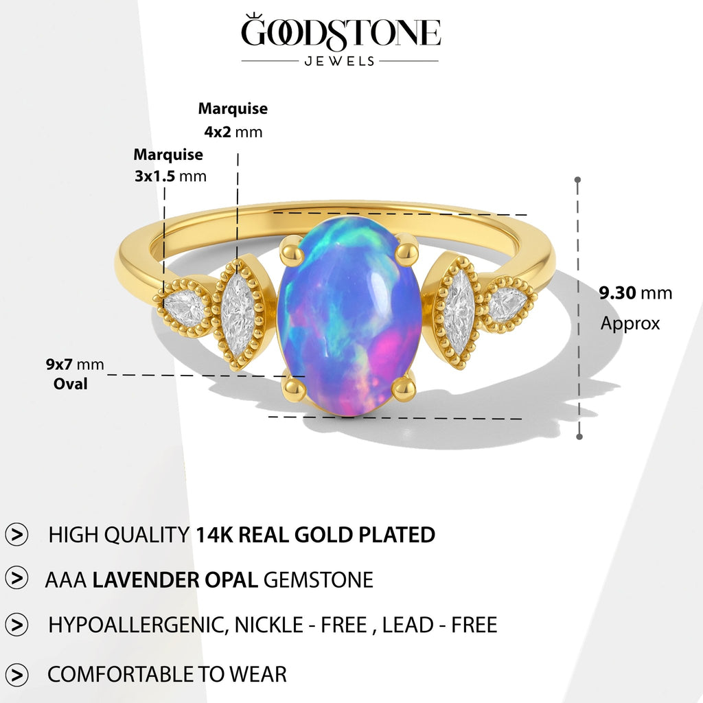 Lavender OpalLavender Opal Silver Ring Shine with elegance wearing this Lavender Opal Sterling Silver Ring. The centerpiece is a vibrant AAA lavender opal (9x7mm oval cut) that displays a mesmerizing play of colors, beautifully accented by delicate marquise-shaped stones on each side for a unique and stylish look.