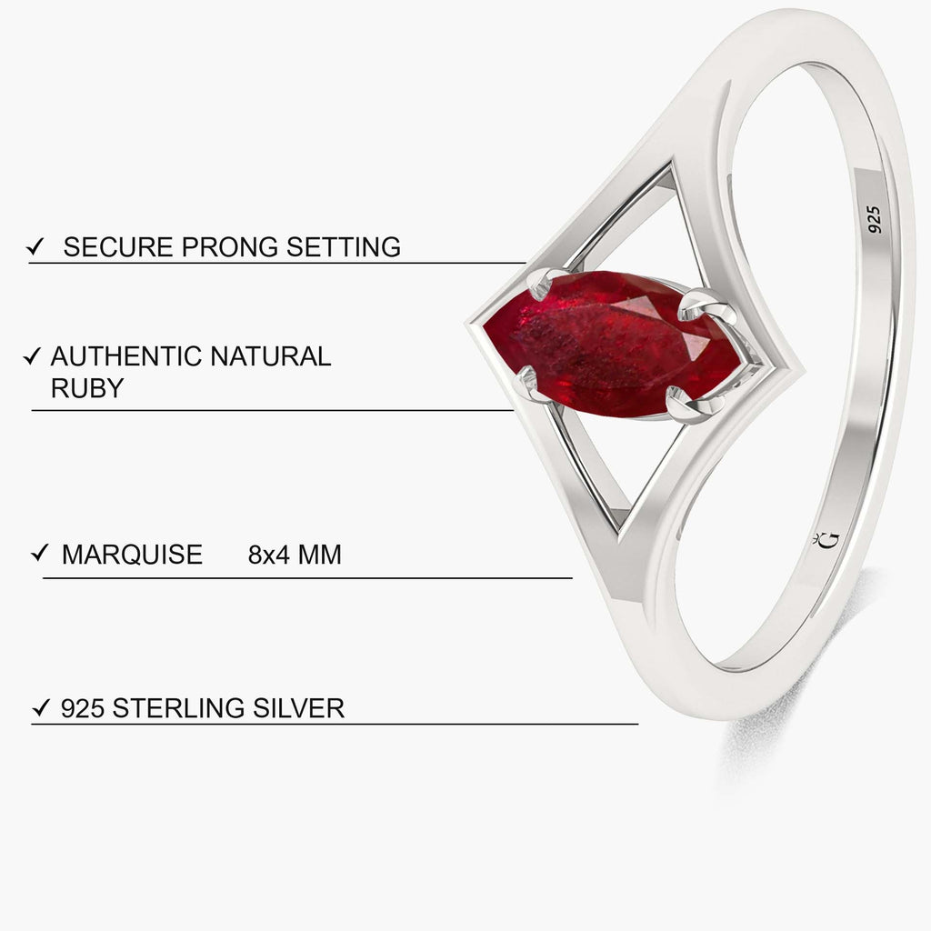 RubyNatural Ruby Solitaire Ring featuring a brilliant 8x4 mm marquise-cut 1.0 carat red ruby, this gemstone ring is delicately handset in 925 sterling silver, offering the perfect balance of luxury and durability. Designed with a sleek and feminine silhouette, this Solitaire ruby ring is ideal for layering or wearing solo. Whether paired with wedding bands or worn as a minimalist engagement ring, it brings charm and sophistication to any look. Crafted for comfort and everyday wear. The ring is crafted from hypoallergenic, tarnish-resistant materials, making it ideal for individuals with sensitive skin.