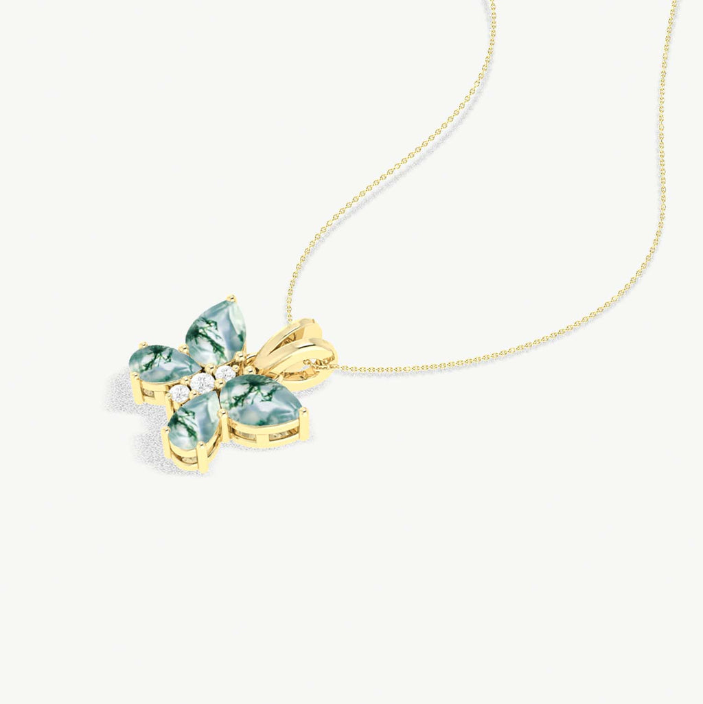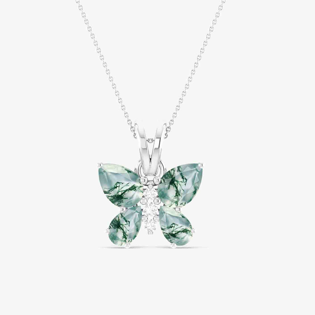 Moss AgateCelebrate natural beauty with our Moss Agate Butterfly Pendant Necklace, expertly crafted in 925 sterling silver. This charming pendant features 1.6 carats of earthy moss agate stones, including two 6x4mm pear-shaped stones and two 5x3mm pear-shaped stones, arranged in a delicate butterfly design. Symbolizing transformation, growth, and harmony, this necklace is a perfect gift or a stylish addition to your jewelry collection.