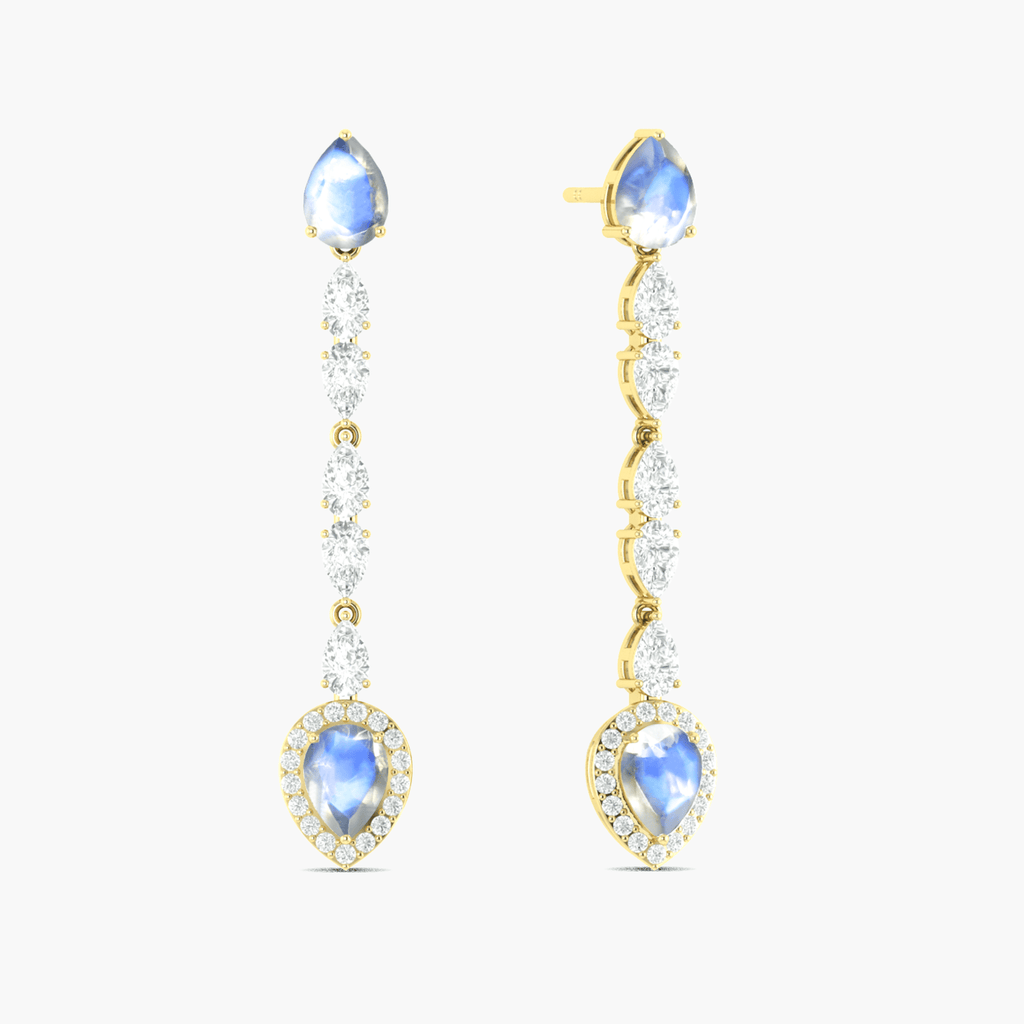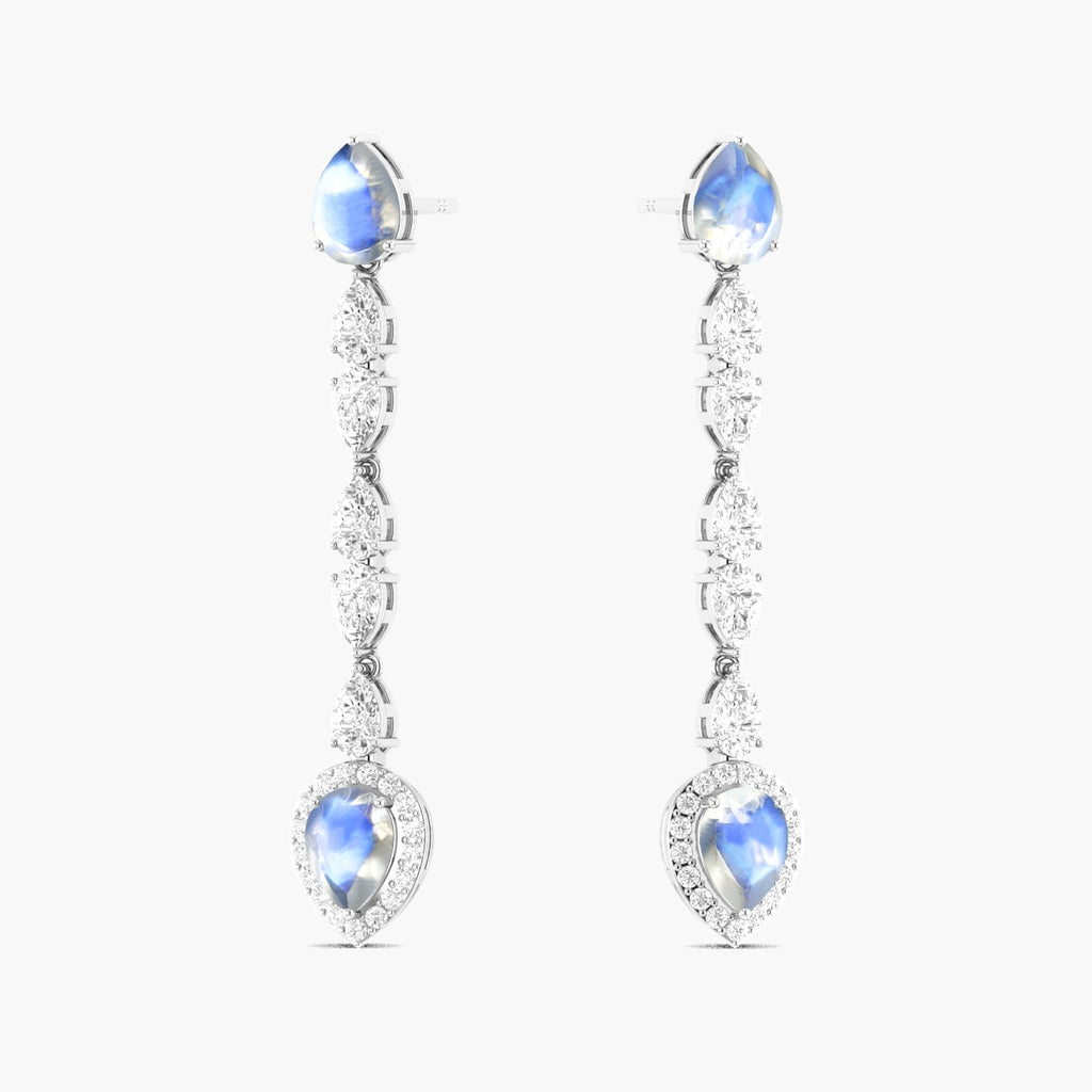MoonstoneIntroducing the Moonstone Long Drop Earrings! This beautiful earring features pear of stunning moonstone and zircon gemstone. Wear it to add a touch of elegance and love to any outfit. Perfect for special occasions or everyday wear, this earring is sure to dazzle and delight.
