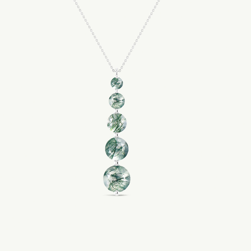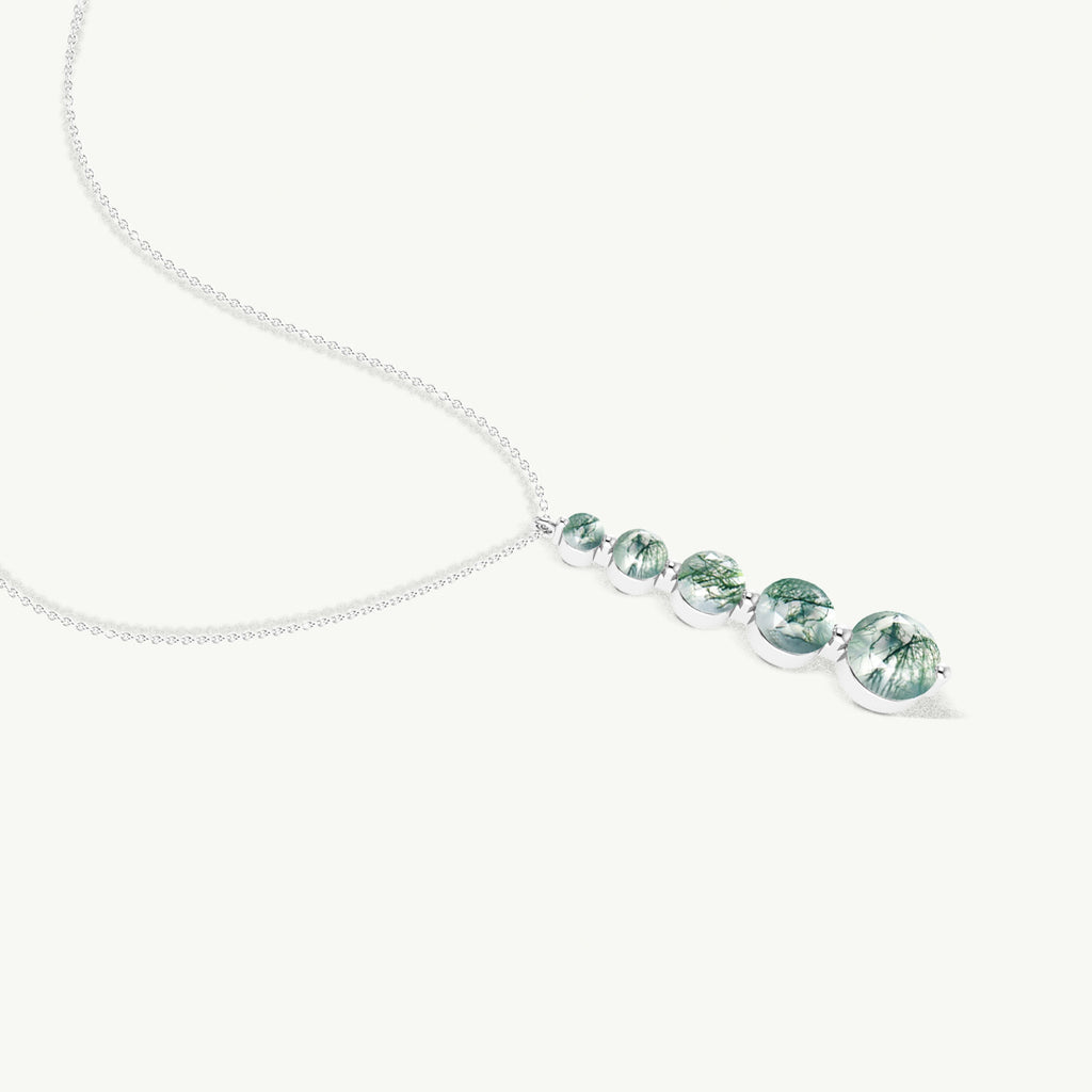 Moss AgateThis Moss Agate 5-Stone Bar Pendant Necklace is crafted in genuine 925 Sterling Silver for a timeless and natural look. Featuring five round moss agate stones ranging from 3mm to 7mm, it offers a total gemstone weight of 4 carats in a sleek vertical design. The pendant measures 34.75 × 7.30 mm and is paired with a 16” cable chain plus 2” extender, secured with a lobster clasp. Perfect for everyday elegance, special occasions, or gifting.