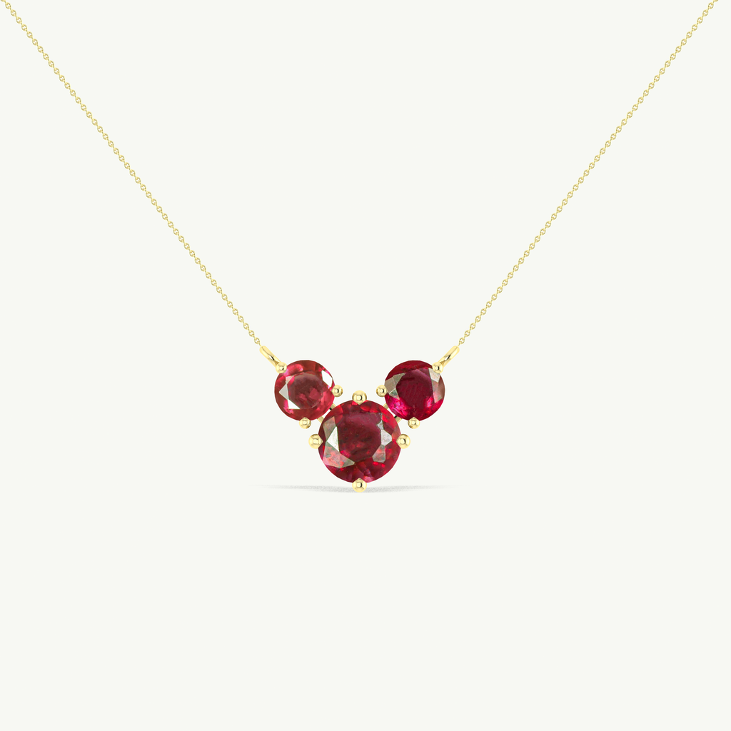 RubyCelebrate timeless elegance with our Ruby Round 3 Stone Pendant Necklace, meticulously crafted in 925 sterling silver. This stunning pendant features a 2.8-carat ruby centerpiece (7mm) flanked by two smaller 5mm round rubies, forming a classic three-stone design that symbolizes love, passion, and sophistication. Perfect for gifting or making a bold style statement, this necklace blends traditional charm with contemporary refinement.