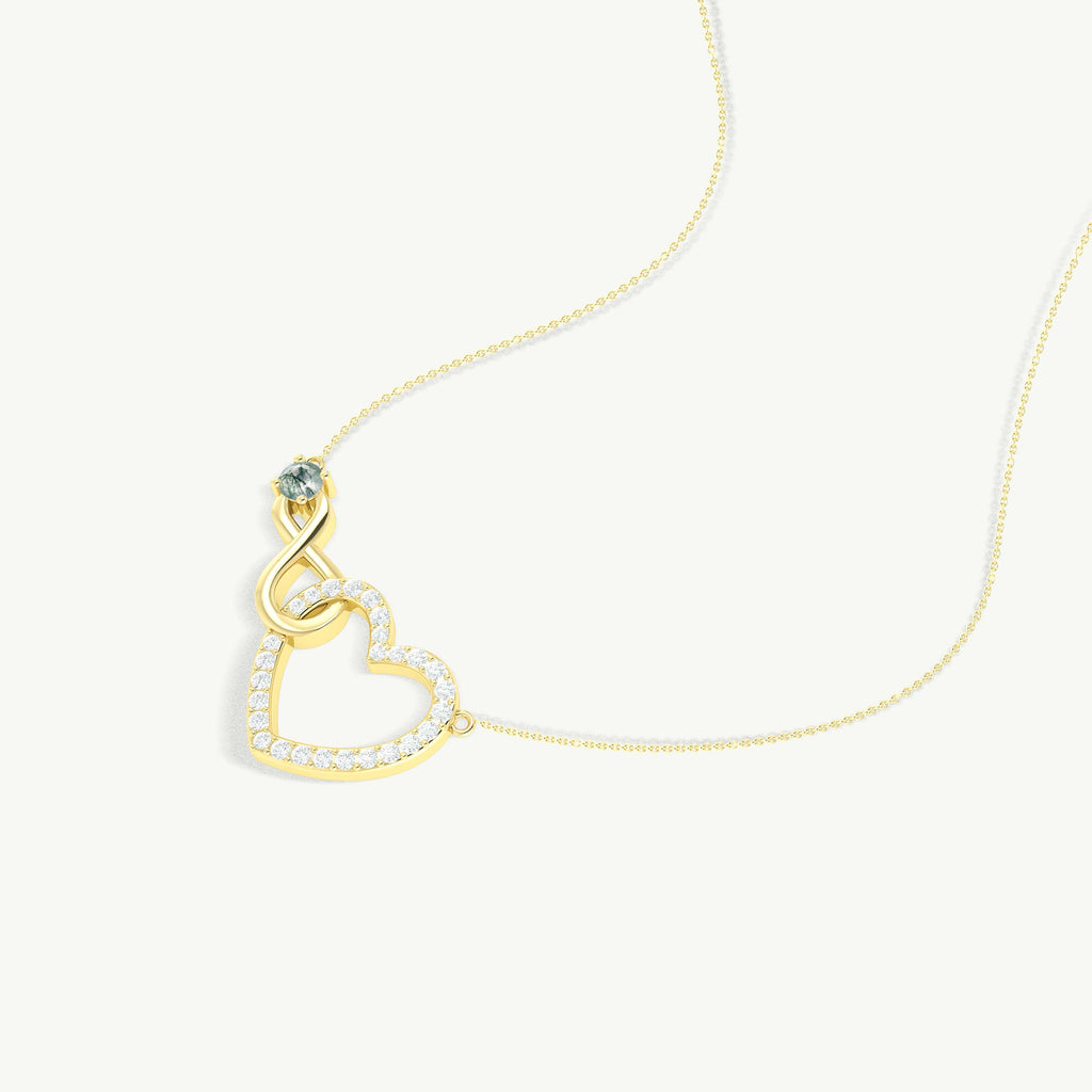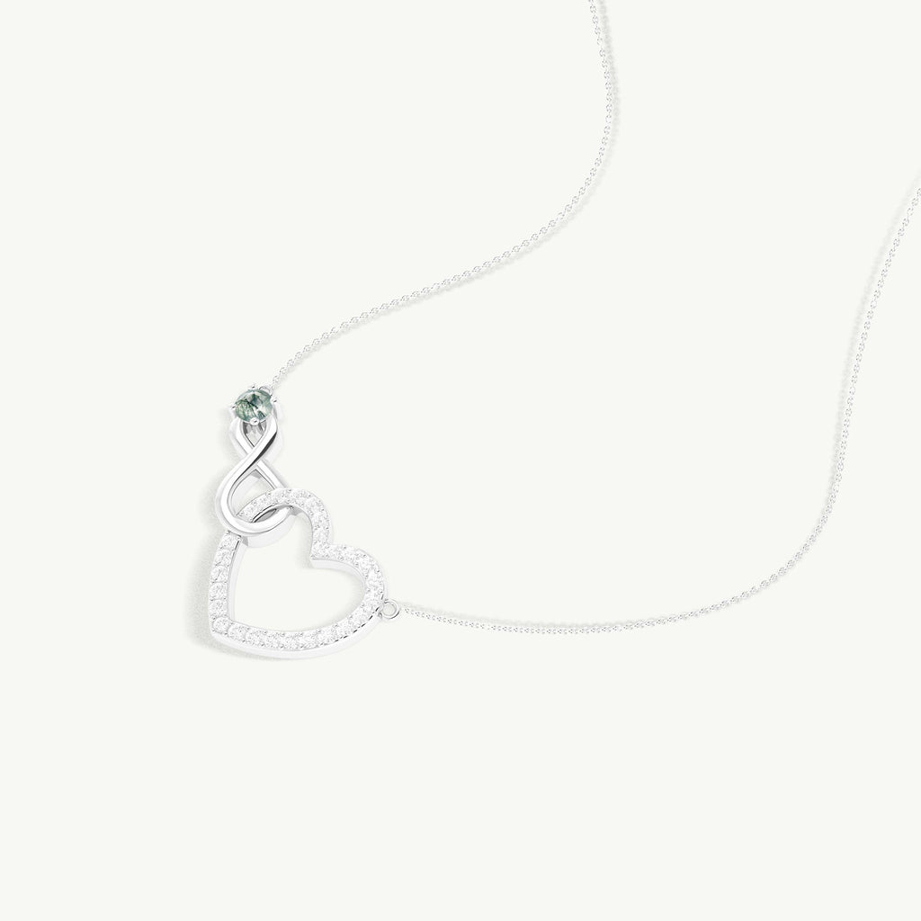 Moss AgateThis Moss Agate Round Infinity Heart Pendant Necklace is crafted in genuine 925 Sterling Silver, featuring a single 4mm round moss agate stone weighing 0.45 carats. The pendant measures 32 × 17.6 mm with a graceful infinity heart design. It includes a 16” cable chain with a 2” extender and secure lobster clasp. Weighing 5.2 grams, this elegant necklace is perfect for everyday wear, special occasions, or gifting to someone special.
