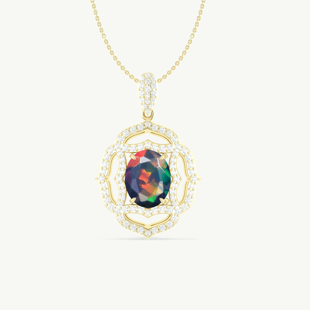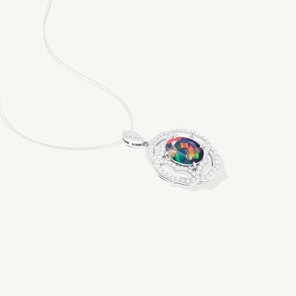 Crafted from natural multi-fire opal, this oval-shaped gemstone pendant necklace is a unique and striking addition to any jewelry collection. With its fiery hues and elegant shape, it adds a touch of sophistication and style to any outfit. Hand-selected for quality and beauty, this pendant is a must-have for gemstone enthusiasts.