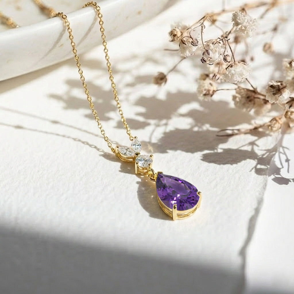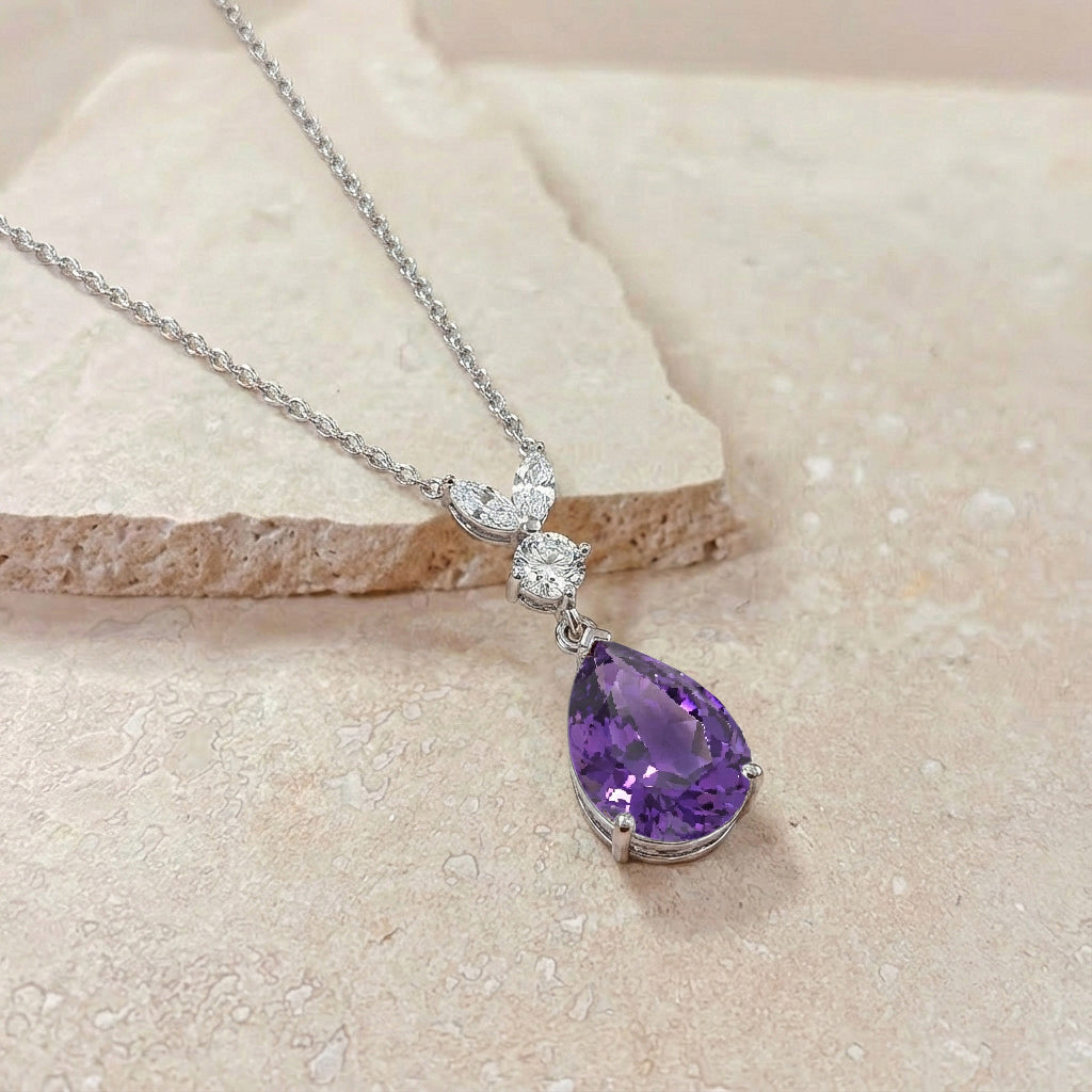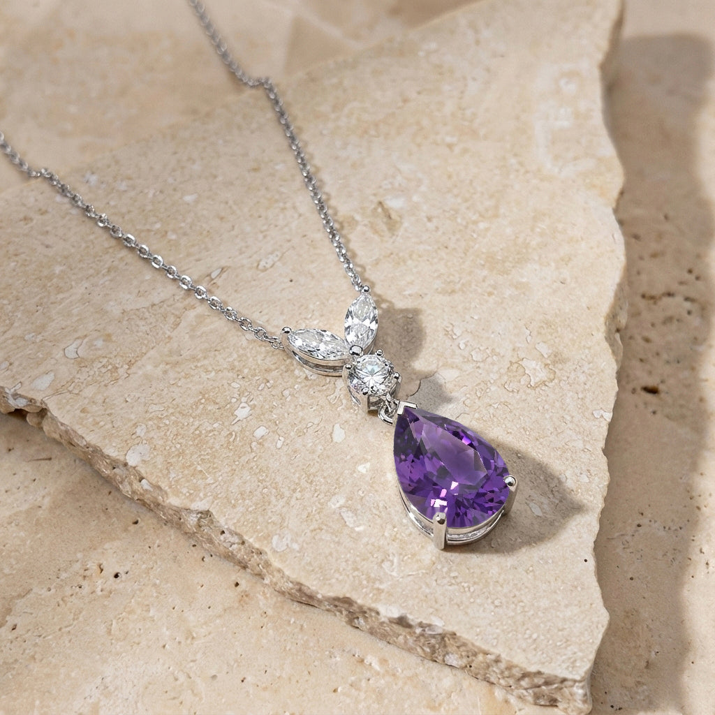 This Amethyst Pear Teardrop Pendant Necklace is crafted in 925 sterling silver and features a 1.70 CT faceted pear-shaped Amethyst (10x7 mm). The elegant pendant measures 21.06 x 7.31 mm and is paired with a 16” + 2” adjustable sterling silver cable chain with a secure lobster clasp. A timeless purple gemstone necklace ideal for gifting or everyday wear.