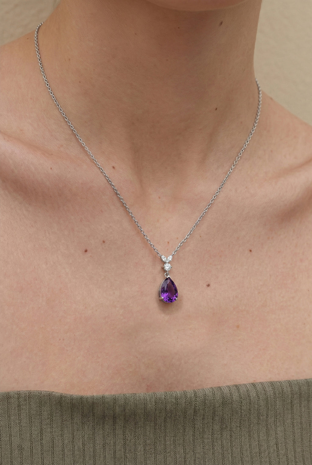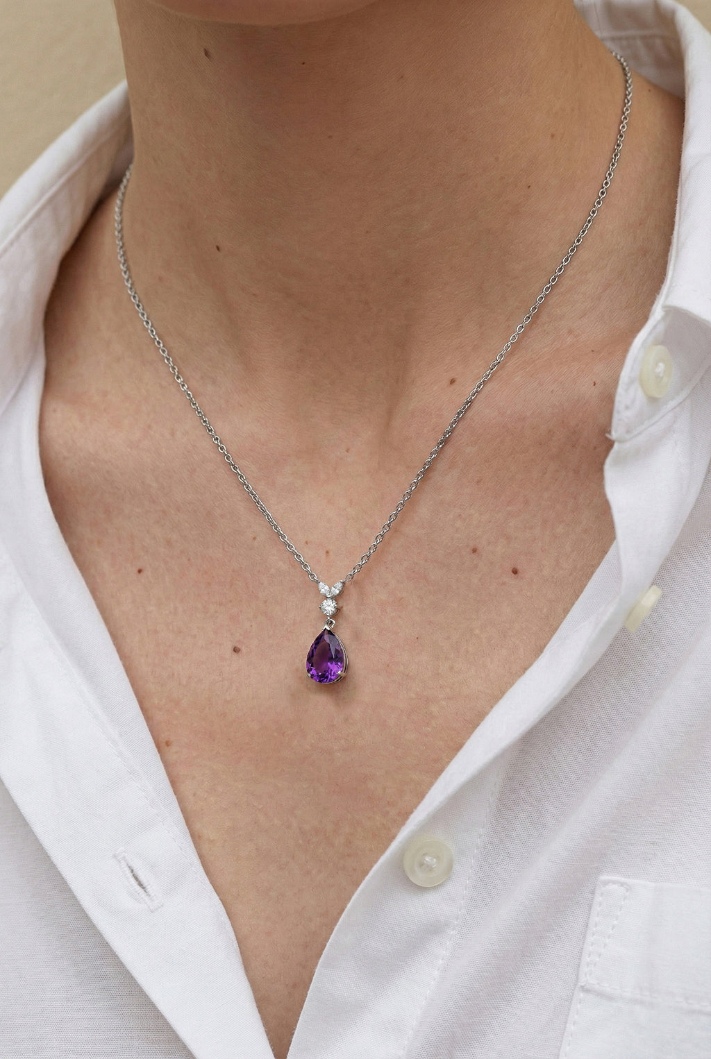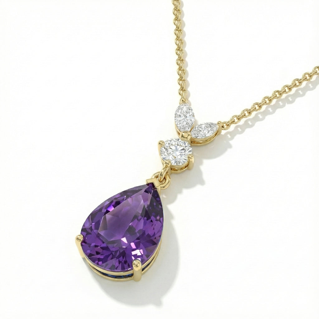 This Amethyst Pear Teardrop Pendant Necklace is crafted in 925 sterling silver and features a 1.70 CT faceted pear-shaped Amethyst (10x7 mm). The elegant pendant measures 21.06 x 7.31 mm and is paired with a 16” + 2” adjustable sterling silver cable chain with a secure lobster clasp. A timeless purple gemstone necklace ideal for gifting or everyday wear.