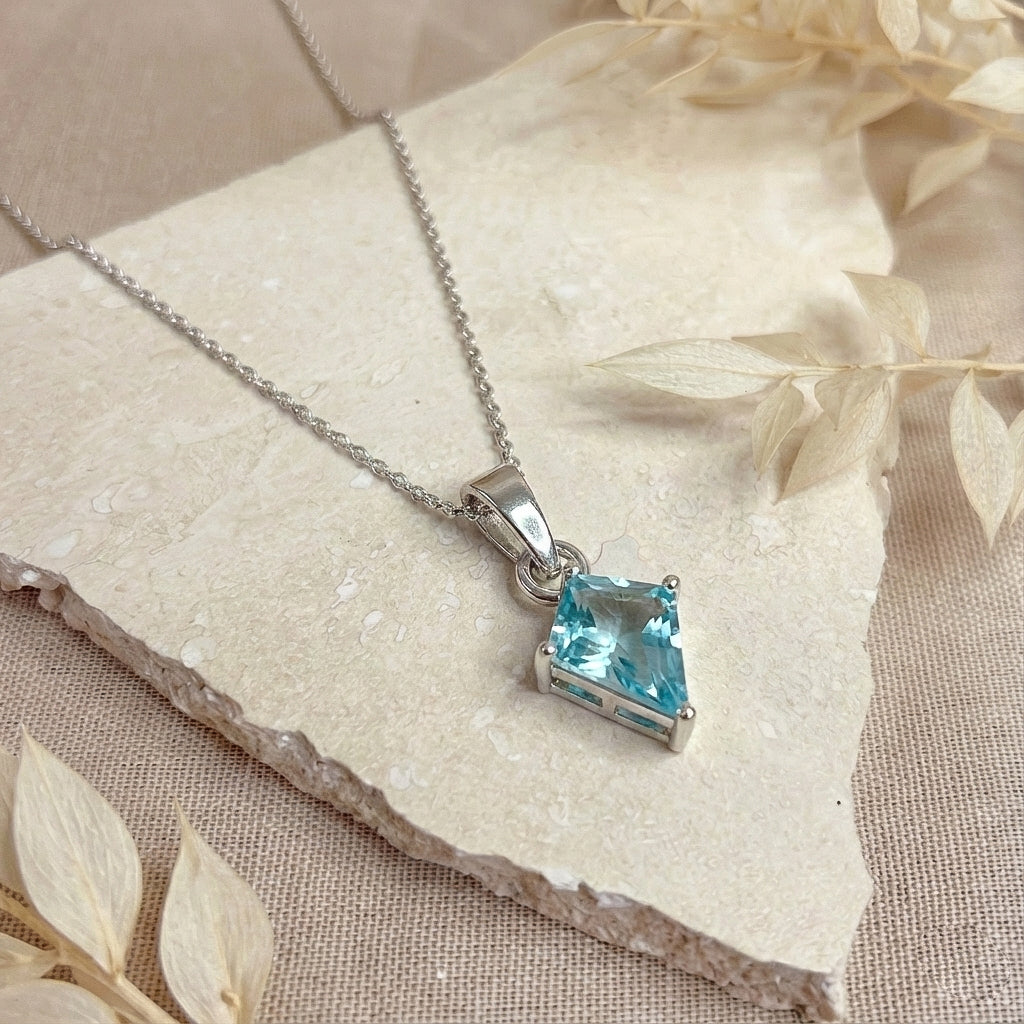 Aquamarine Solitaire Kite Pendant Necklace in 925 Sterling Silver 1.4ct features a beautiful 9x7mm kite-shaped faceted aquamarine gemstone with serene blue tones. The pendant measures 18.20 x 7.40mm and hangs from a 16” + 2” adjustable cable chain with a secure lobster clasp. Crafted from premium sterling silver and weighing 3.7 grams with the chain, this elegant necklace offers timeless elegance, refreshing color, and everyday comfort—perfect for gifting or enhancing any jewelry collection.