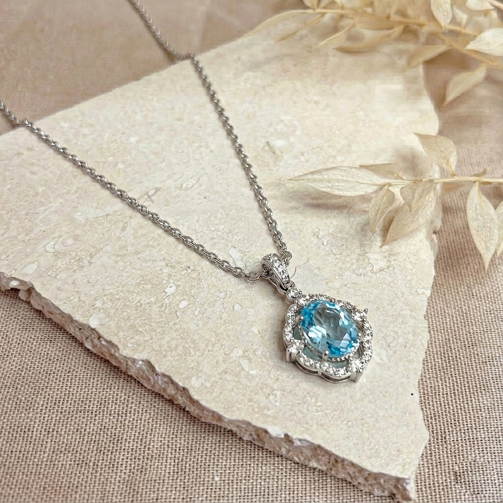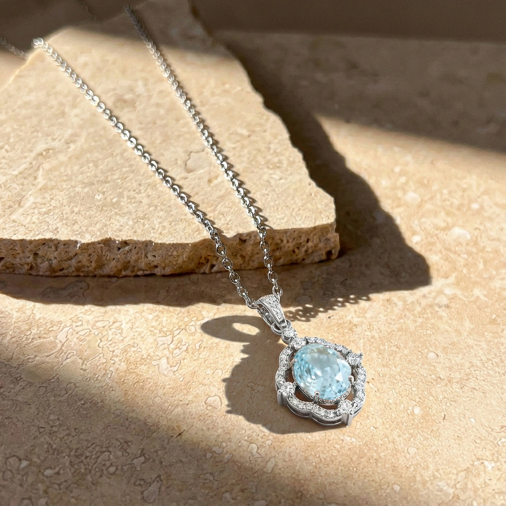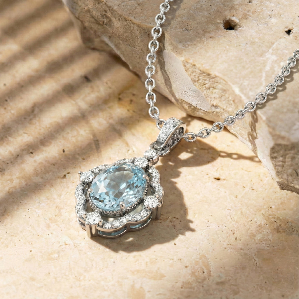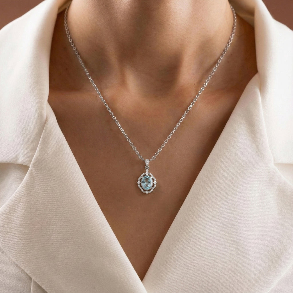 Brighten your style with our Aquamarine Oval Halo Pendant Necklace in 925 sterling silver. Featuring a 1.2ct faceted aquamarine (8x6mm) encircled by sparkling CZ stones, this 25x12mm pendant hangs on a 16” + 2” cable chain. Lightweight at approximately 3.5g, it’s perfect for everyday elegance or special occasions. A timeless, handcrafted piece that showcases natural beauty and American craftsmanship—ideal for gifting or adding a touch of sophistication to your jewelry collection.