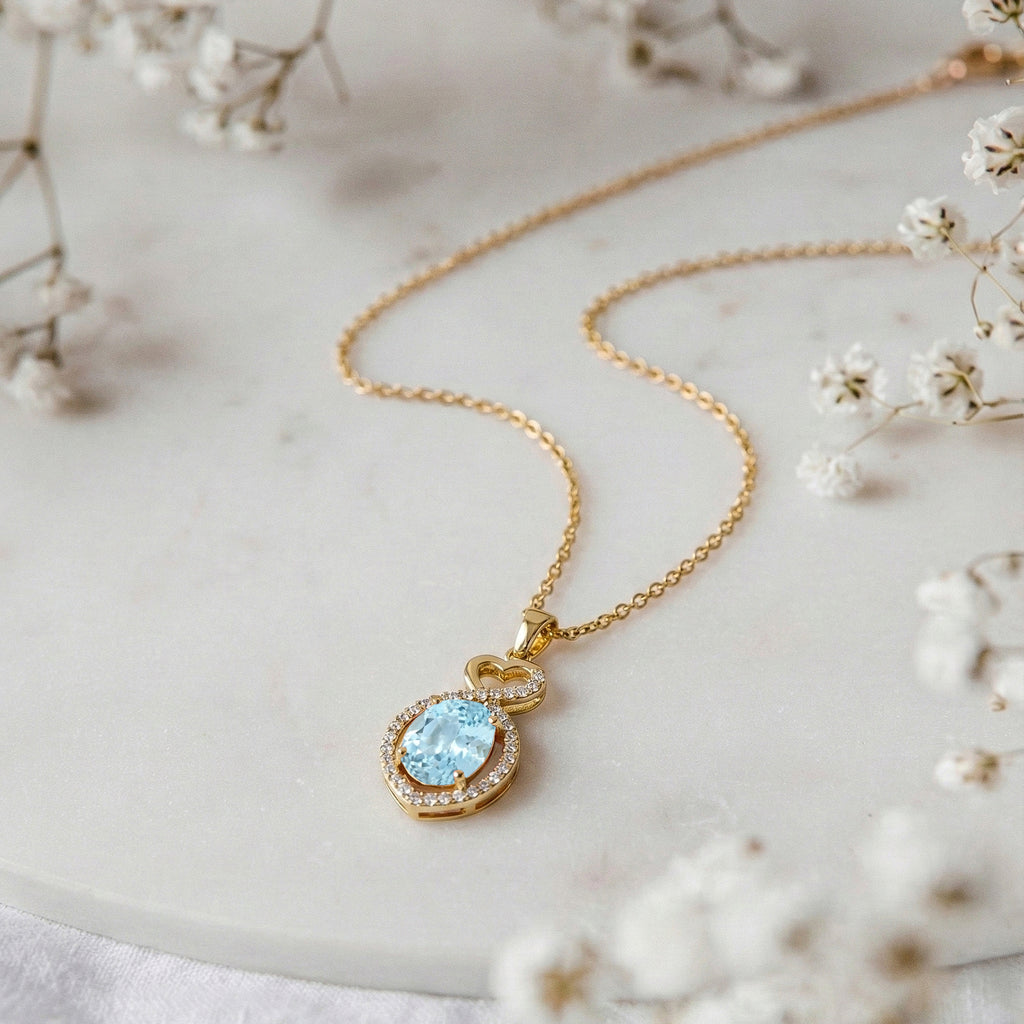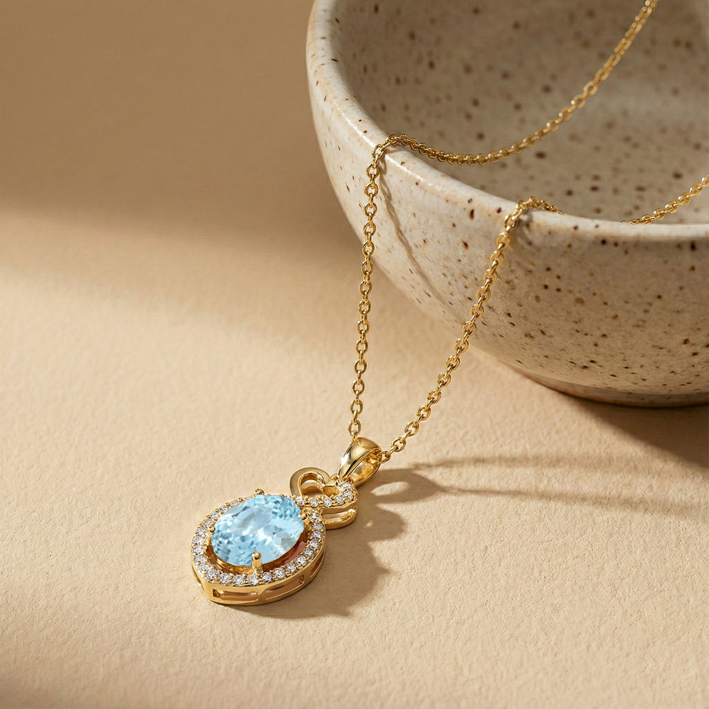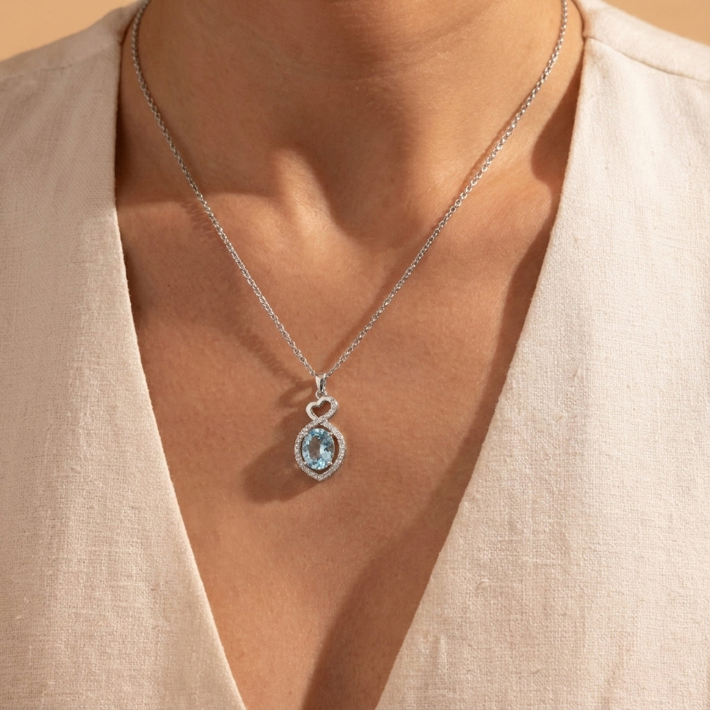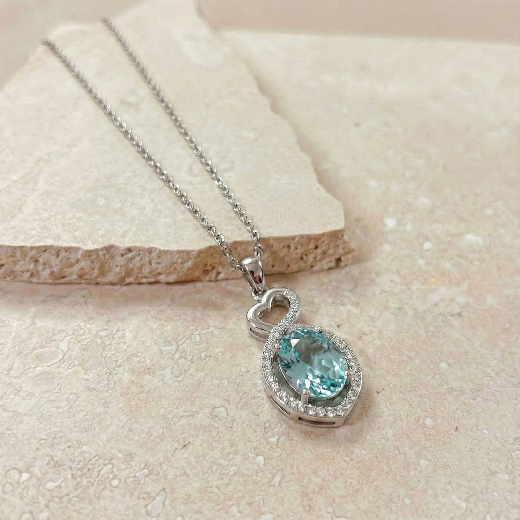 Aquamarine Oval Infinity Twist Heart Pendant Necklace in 925 Sterling Silver showcases a 1.2ct oval-cut aquamarine (8x6mm) set in a graceful infinity twist heart design, accented with 2ct sparkling cubic zirconia. The pendant measures 24.55 x 11.64mm and hangs from a 16” + 2” adjustable cable chain with a secure lobster clasp. Crafted from premium sterling silver, this elegant necklace features serene blue hues, timeless elegance, and everyday comfort—perfect for gifting or adding a romantic, eye-catching touch to any jewelry collection.