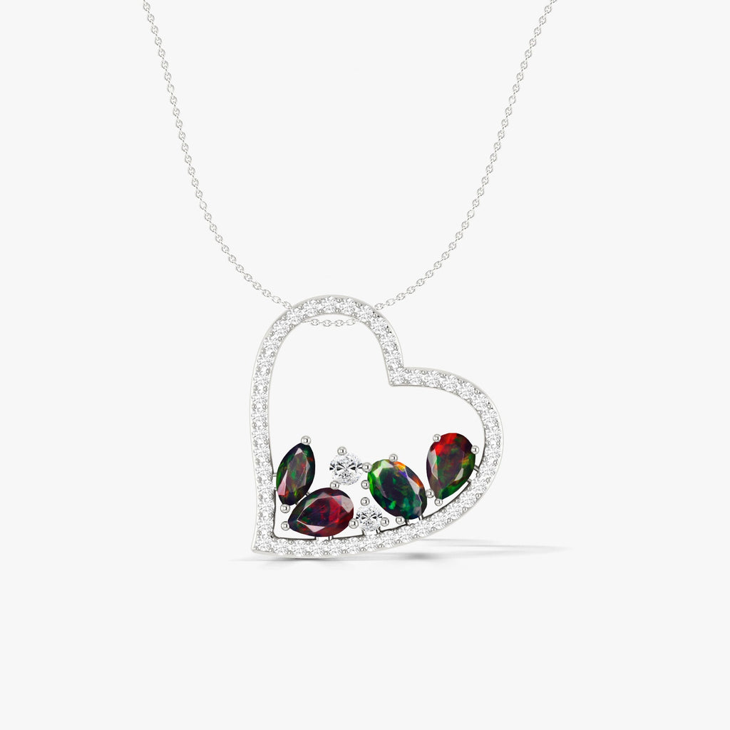 Black OpalElevate your jewelry collection with the stunning GOODSTONE JEWELS Natural Black Opal 4 Stone Heart Pendant Necklace a true symbol of elegance, beauty, and timeless sophistication. Designed to captivate, this necklace features a unique heart-shaped pendant adorned with four handpicked, natural Black Opal stones that effortlessly enhance the luxurious appeal of the necklace. Whether you're seeking a statement piece for a special occasion or an everyday accessory that radiates elegance, this necklace is the perfect choice. This gorgeous pendant showcases a total of 1.6 carats of vibrant, natural Black Opal gemstones. Three Oval-shaped stones (6x4 mm) and one Marquise-cut stone (6x3 mm) are carefully set into the heart-shaped pendant, creating a stunning visual effect.