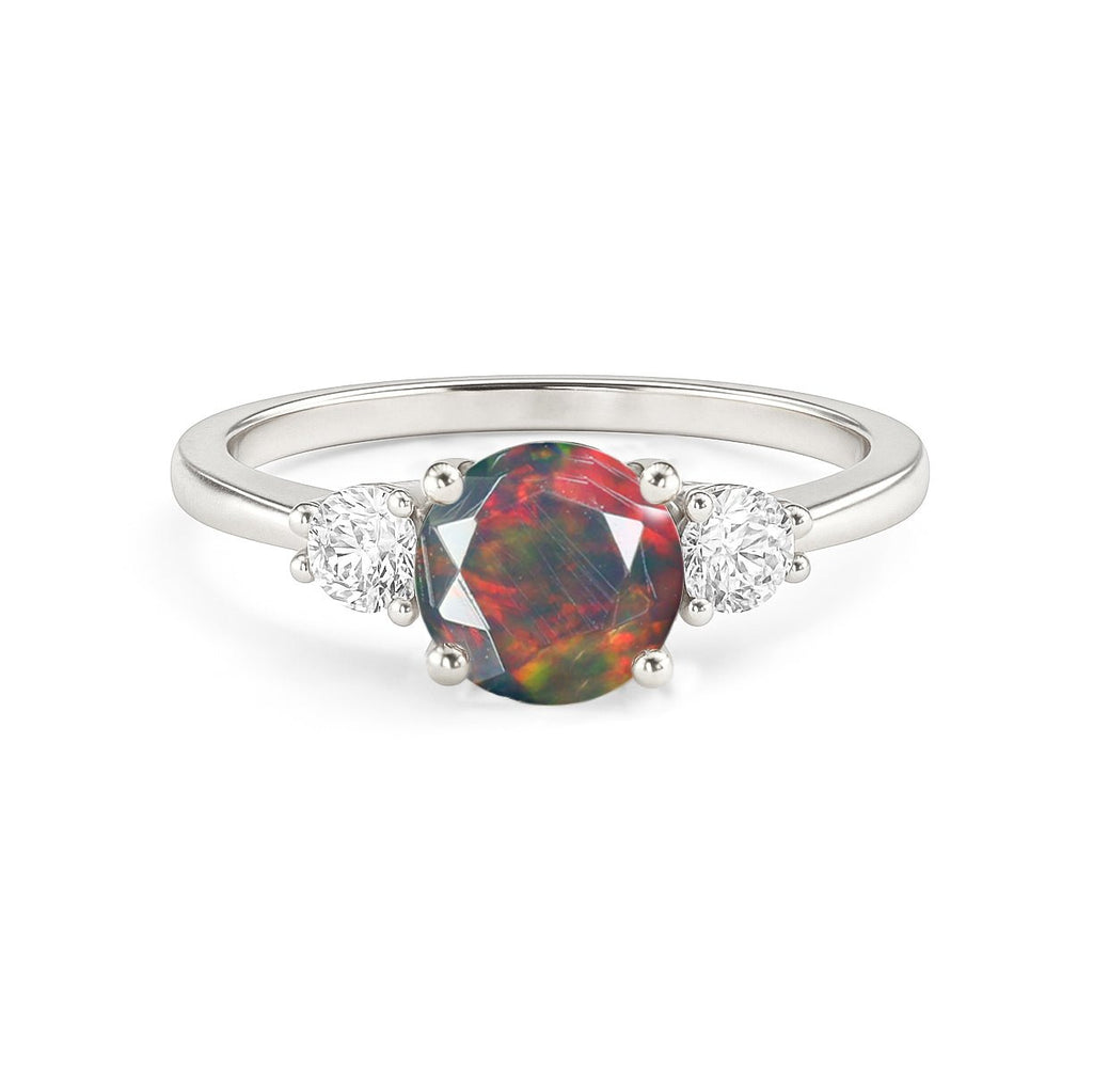 Black OpalCelebrate timeless elegance and meaningful symbolism with this exquisite Trilogy Ring, expertly crafted in 925 Sterling Silver with Yellow Gold Plating. At its heart lies a 6mm round-cut natural Black Opal, shimmering with its signature play of color and weighing approximately 0.8 carats. Flanked on either side by brilliant White Cubic Zirconia stones, the trio of gems represents the past, present, and future, making this ring a perfect token of love, memory, and promise, Each gemstone is faceted cut to maximize brilliance and fire, creating a captivating visual contrast between the mystic allure of the Black Opal and the icy sparkle of Cubic Zirconia. With a metal weight of 2.60 grams, this piece is lightweight yet durable for everyday wear or special occasions.