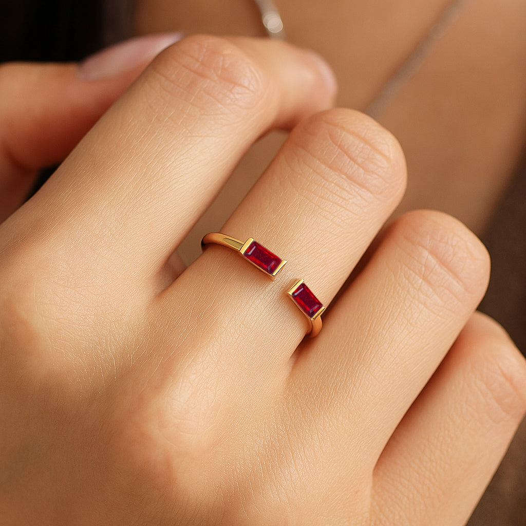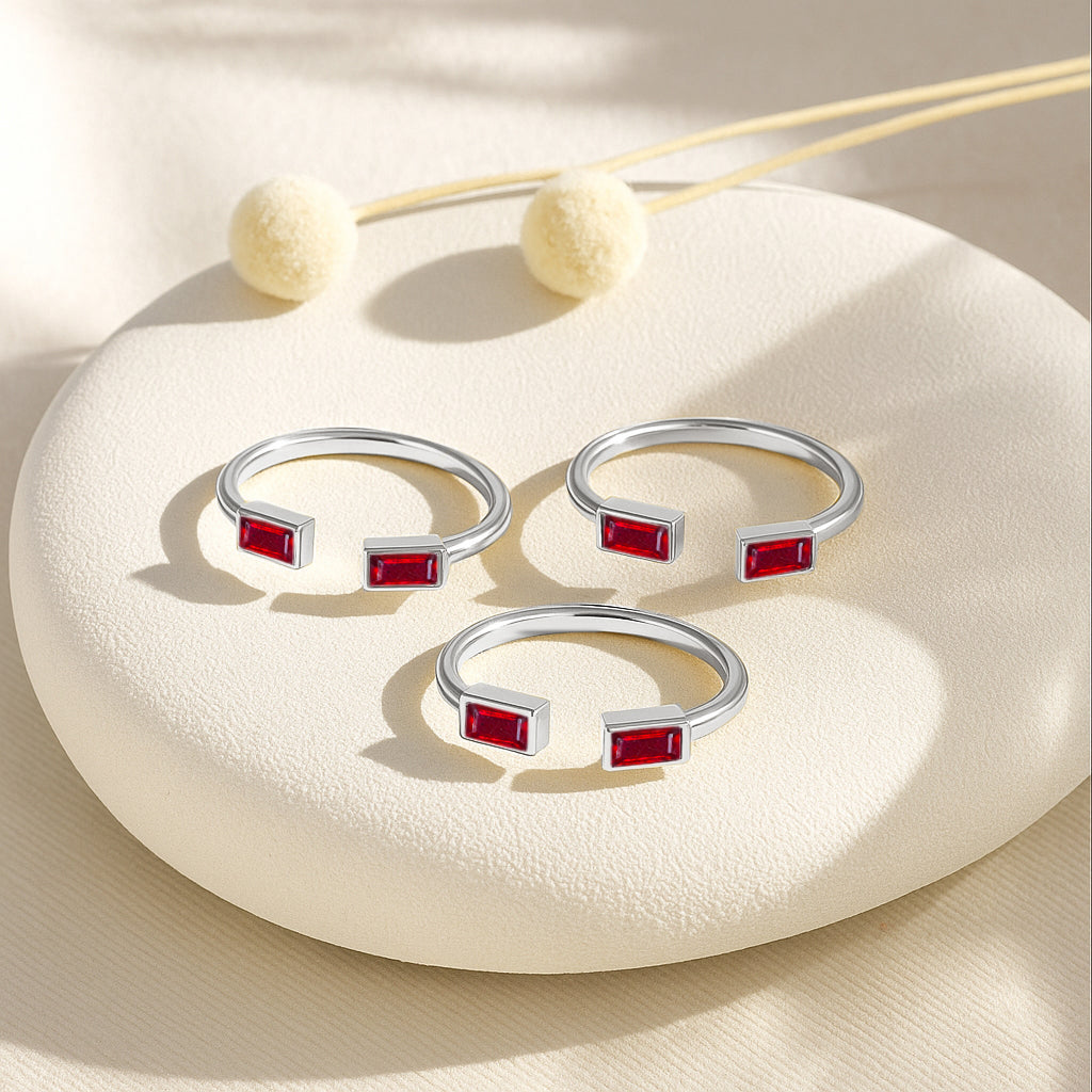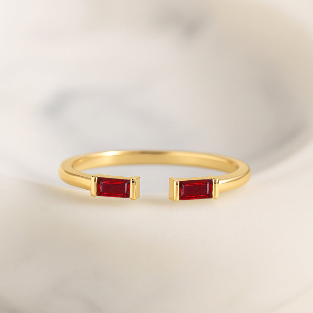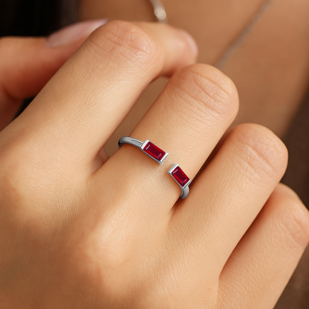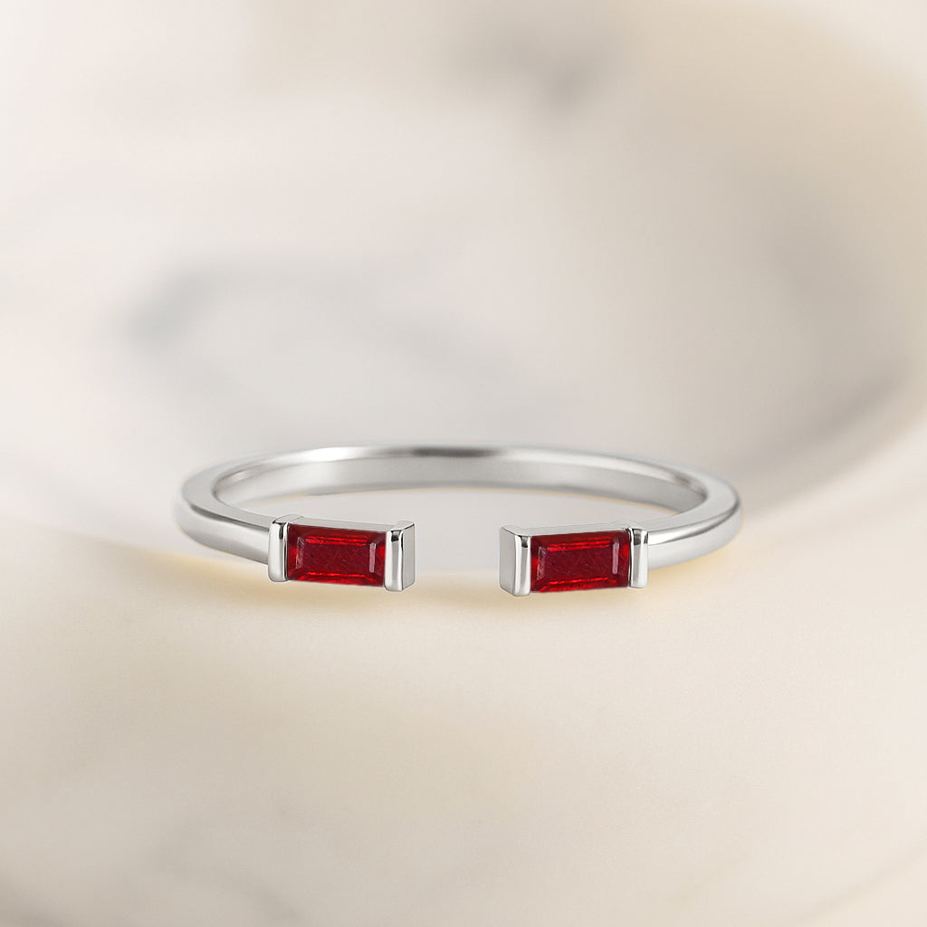 RubyElevate your everyday style with this elegant Baguette Stone Open Ring, crafted in high quality 925 sterling silver. The design features a natural ruby baguette stone measuring 5x2 mm, offering a vivid pop of red and a sleek modern silhouette. With a total gemstone weight of 0.80 carat and an approximate ring weight of 1.75 g, it delivers both comfort and luxury. The open-band style adds a contemporary touch, making it a perfect statement piece for any jewelry collection.