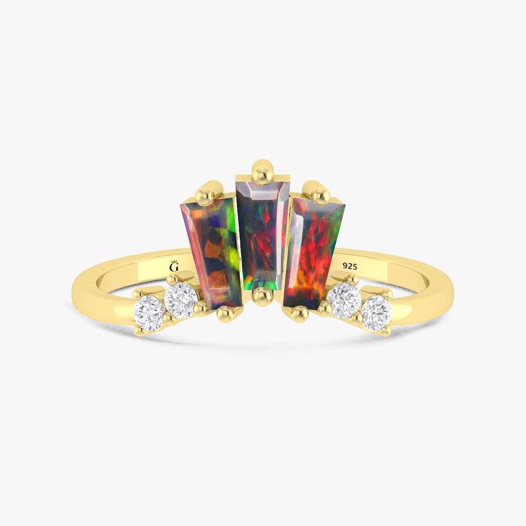 Black OpalNatural Black Opal Wishbone Crown Style Ring for women, featuring a stunning 2.7-carat genuine black opal in 925 sterling silver. Renowned for its vibrant play of color and deep tones, this opal radiates brilliance from every angle. The opal is accented with three 6x3x2 mm baguette-faceted stones, creating a sleek, modern sparkle that enhances its unique charm. Inspired by royalty, the Wishbone Crown Style setting adds a touch of elegance and sophistication, perfect for women who appreciate fine craftsmanship and meaningful design. Whether you’re looking for a promise ring, engagement ring, or anniversary gift, this piece makes a heartfelt statement.