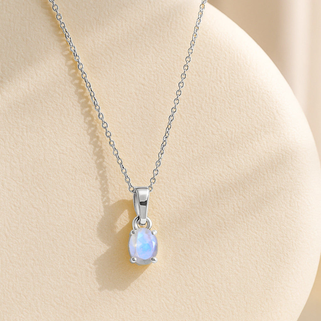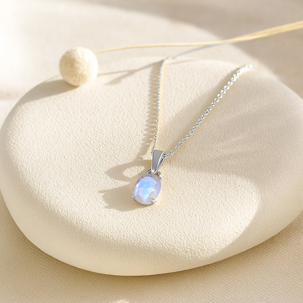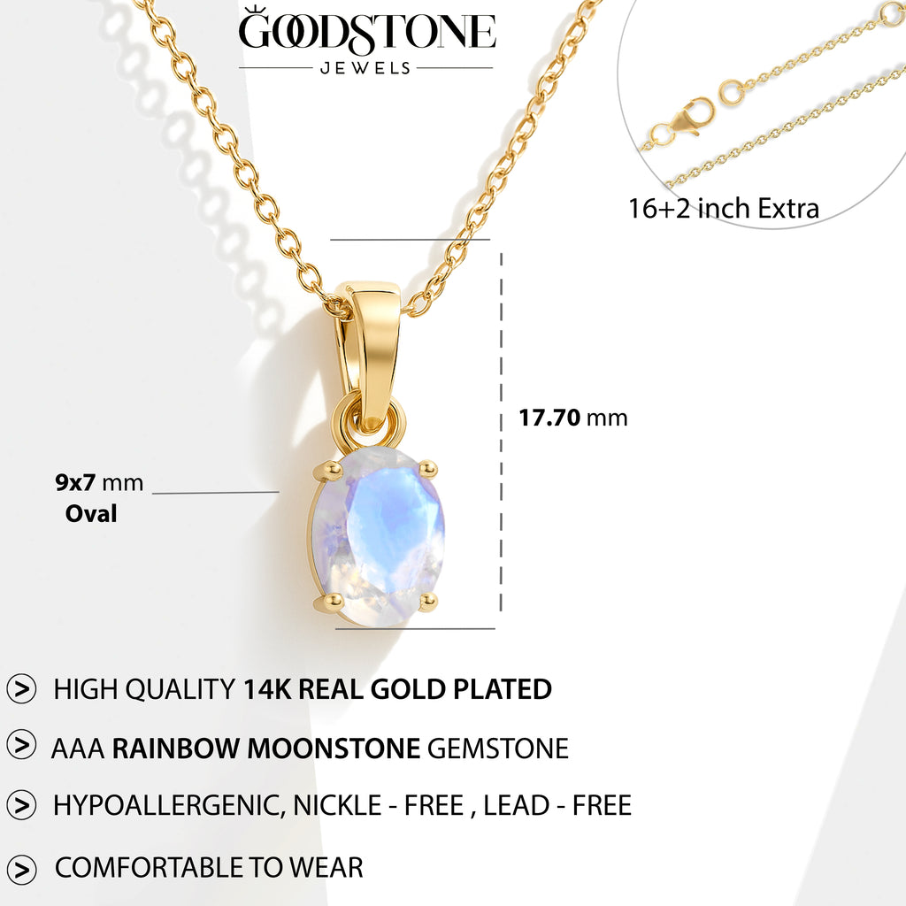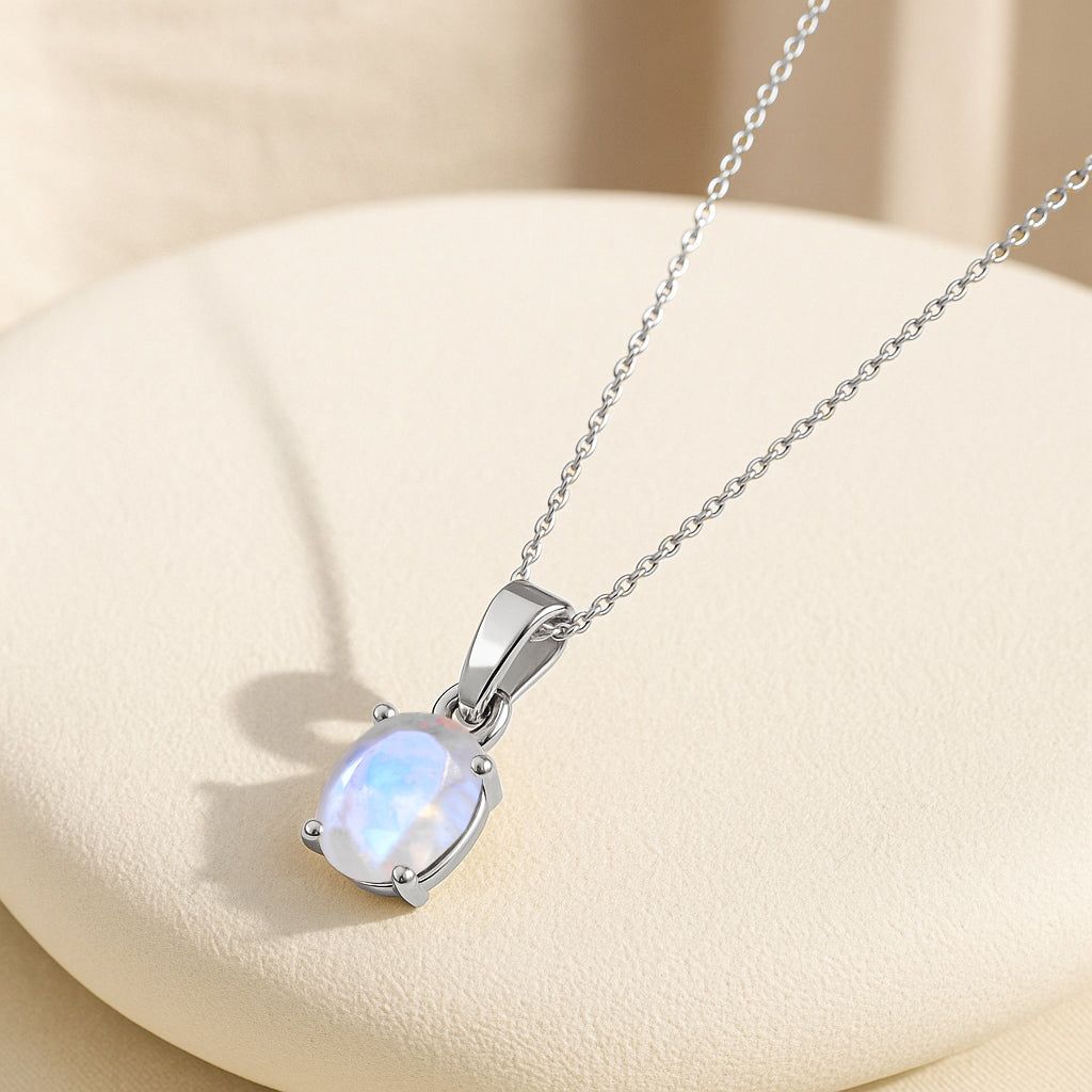 MoonstoneIlluminate your look with this Moonstone Oval Stone Pendant Necklace, crafted in premium 925 sterling silver. The pendant features a mesmerizing 7×9 mm oval-cut moonstone weighing 1.40 carat, known for its soft glow and ethereal charm. Measuring 17.70×7.00 mm, it hangs gracefully from a 16″ + 2″ adjustable cable chain. With an approximate weight of 1.60 g, this lightweight yet elegant necklace adds a touch of serenity and sophistication to any jewelry collection.