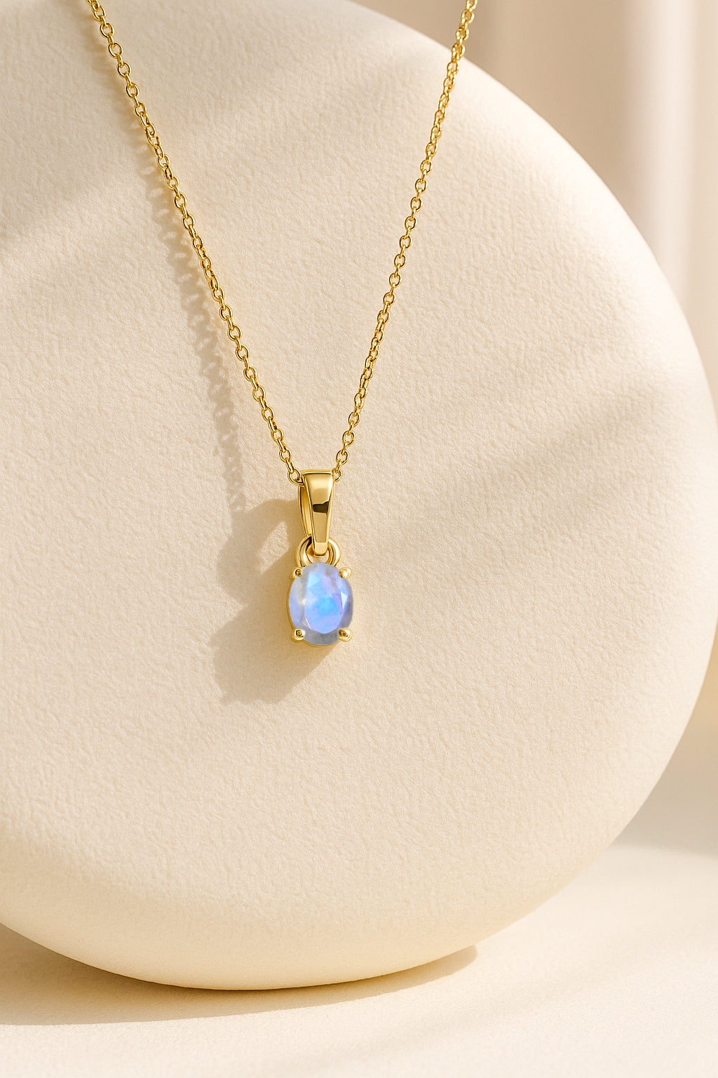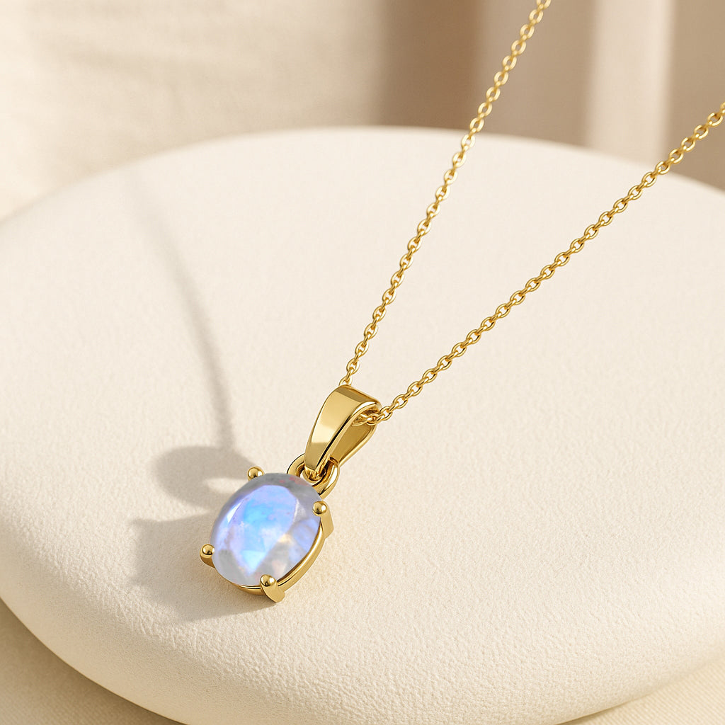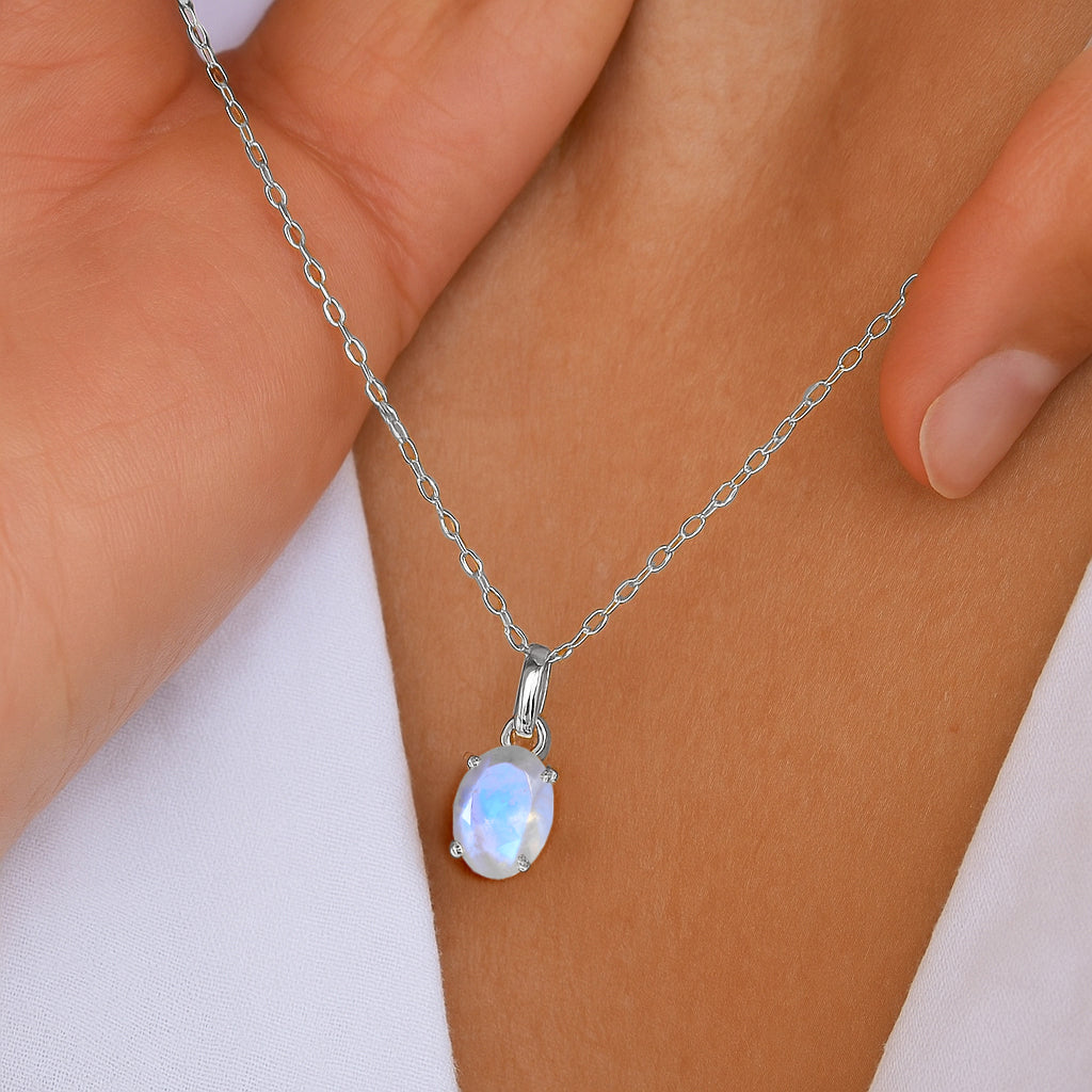 MoonstoneIlluminate your look with this Moonstone Oval Stone Pendant Necklace, crafted in premium 925 sterling silver. The pendant features a mesmerizing 7×9 mm oval-cut moonstone weighing 1.40 carat, known for its soft glow and ethereal charm. Measuring 17.70×7.00 mm, it hangs gracefully from a 16″ + 2″ adjustable cable chain. With an approximate weight of 1.60 g, this lightweight yet elegant necklace adds a touch of serenity and sophistication to any jewelry collection.