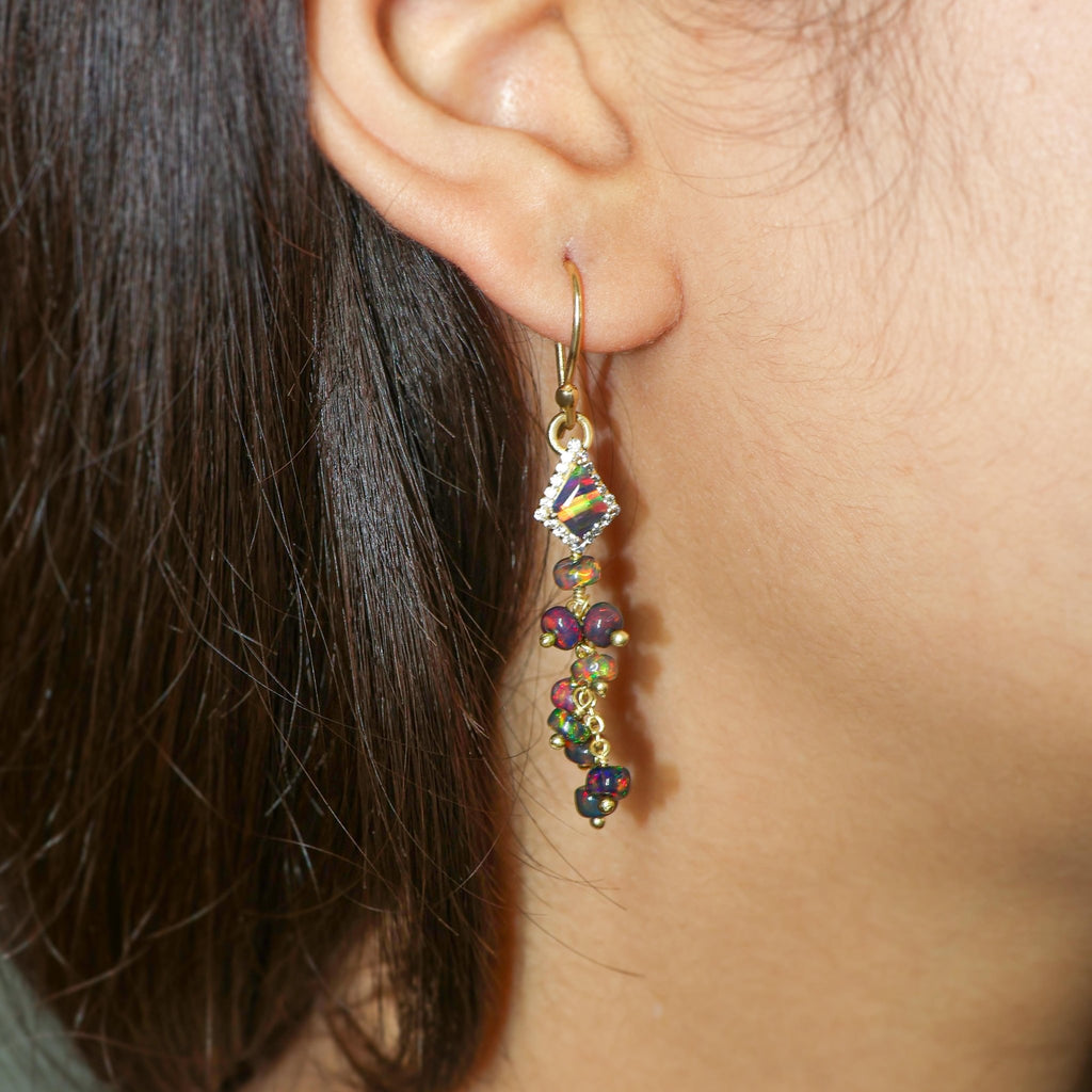 Black OpalNatural Black Opal Charm Beaded Cluster Earrings for Women. Designed to captivate, each earring features natural black opal beads arranged in a delicate cluster, glowing with soft, iridescent hues that catch the light with every movement. Crafted from premium 925 sterling silver and finished with yellow gold fill, these earrings blend quality craftsmanship with luxurious style. More than just a beautiful piece, these earrings make a thoughtful gift for the women who matter most—whether it's your mother, sister, wife, or best friend. Ideal for birthdays, holidays, anniversaries, or simply as a gesture of love, they come beautifully packaged and ready to impress.